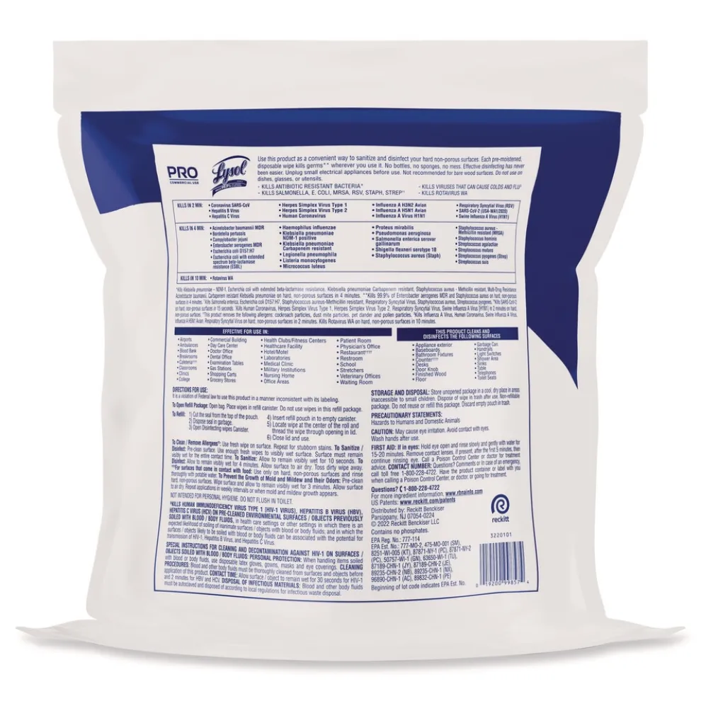 Optimize cleaning with high-capacity Lysol Professional Disinfecting Wipes that help you meet high-volume needs and reduce restock times for cleaning supplies. Pre-moistened disinfecting wipes kill 99.9% of viruses and bacteria, including the virus that causes COVID-19 when used as directed on hard, non-porous surfaces. Hospital-type disinfection works on a variety of surfaces, including electronics. Quickly clean and disinfect high-touch germ hot spots to help protect your customers and staff. Clean up and keep moving with packaging that’s easy to open, dispense, and store.