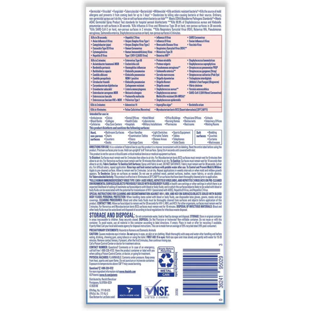 Lysol I.C. Disinfectant Spray is a tuberculocidal, bactericidal, virucidal, and fungicidal formula that works on both soft and hard, non-porous surfaces. Help protect patients across a range of healthcare settings with a disinfectant that can kill over 100 different microorganisms. Disinfect frequently touched surfaces across several areas, including waiting rooms, patient exam rooms, resident rooms, and restrooms. Kill 99.9% of viruses and bacteria (including Tuberculosis) when used as directed on hard, non-porous and soft surfaces. The ready-to-use formula allows employees to disinfect and keep moving. Contains a minimal fragrance ideal for disinfection for healthcare settings (4.5x less fragrance than Lysol Brand III Disinfectant Spray).