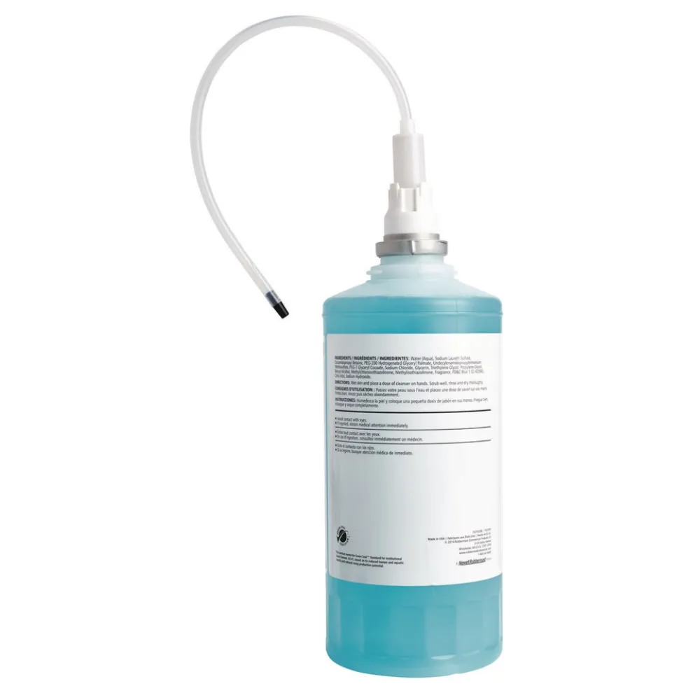 Rubbermaid Commercial Enriched Hand Soap Lotion with Moisturizers is a high-capacity refill designed for One Shot and manual liquid soap dispensers. Each hand soap refill averages up to 2000 hand washes for reduced labor and soap costs. This lotion dispenser soap is enriched with glycerin, silk proteins, aloe Vera, and vitamin E. The rich, pearlized teal soap is biodegradable, hypoallergenic and features a light passion fruit flower scent.