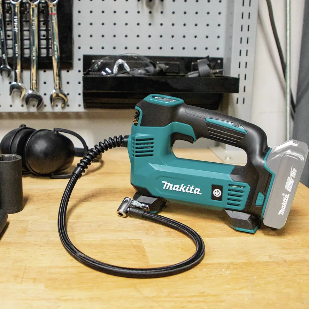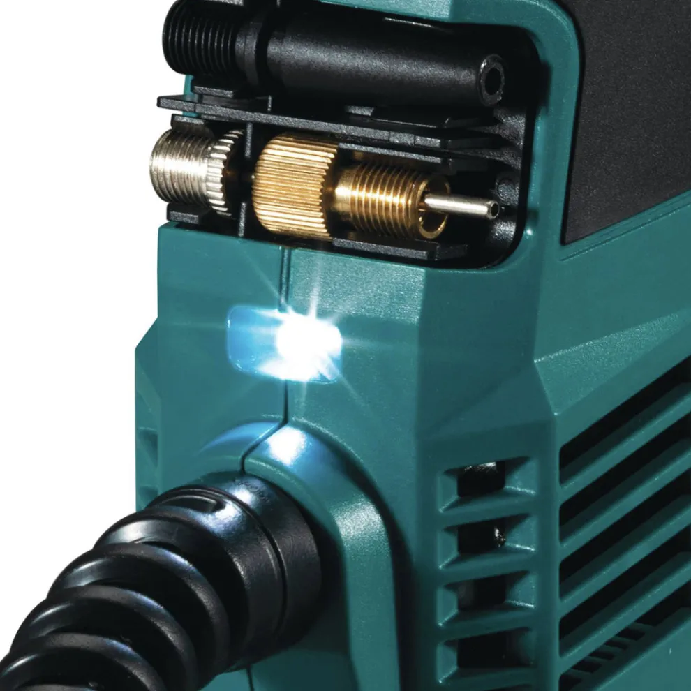 Inflate car tires, bike tires, or sports balls quickly with the 18V LXT Cordless Inflator. The Makita-built motor delivers up to 120 PSI. The tool features a high visibility pressure gauge display with backlight, LED light, and an auto-stop function when the desired pressure is reached. A 25-1/2 in. hose length provides better reach. The compact design allows for easy portability and convenient storage.