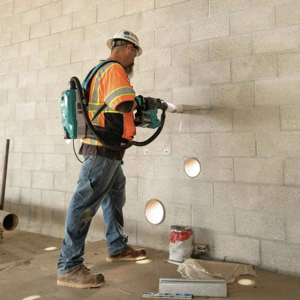 The 40V Max XGT Brushless 1-3/16 in. AVT Rotary Hammer with Interchangeable Chuck, AWS Capable (GRH09M1) is a cordless concrete solution designed for heavy-load applications. It delivers the power, speed, and run-time for corded demands, without the cord. The quick-change chuck allows for interchangeability from SDS-PLUS to 1/2 in. Keyless chuck for utilization of straight shank bits. The GRH09M1 is powered by a 40V Max battery with a Makita-built brushless motor that combine to deliver the power and performance required for heavy-load applications. It can deliver up to 135 of 3/8 in. Holes using a fully charged 40V XGT 4 Ah Battery. The variable speed dial and trigger enables user to match the speed to the application. This hard-hitting performance is combined with advanced comfort and convenience features including Active Feedback-Sensing Technology (AFT), which electronically turns off the motor if rotation of bit is suddenly forced to stop. It is also equipped with Anti-Vibration Technology (AVT) for reduced vibration. More than just a padded handle, AVT is an internal counterbalance that uses air pressure to move counterweight pistons in the opposite direction of the drive piston to actively reduce vibration. In addition, the vibration-absorbing back handle and side handle are engineered to further reduce vibration. For added durability in harsh job site conditions, Extreme Protection Technology (XPT) is engineered for improved dust and water resistance. The GRH09M1 has dust extraction capability (sold separately) and is OSHA Table 1 Compliant with an on-board HEPA Dust Extractor or stand-alone AWS Extractor options. For added efficiency, the Rotary Hammer is equipped with Auto-Start Wireless System (AWS), which uses Bluetooth technology for wireless power-on and power-off communication between the equipped tool and dust extractor (sold separately).