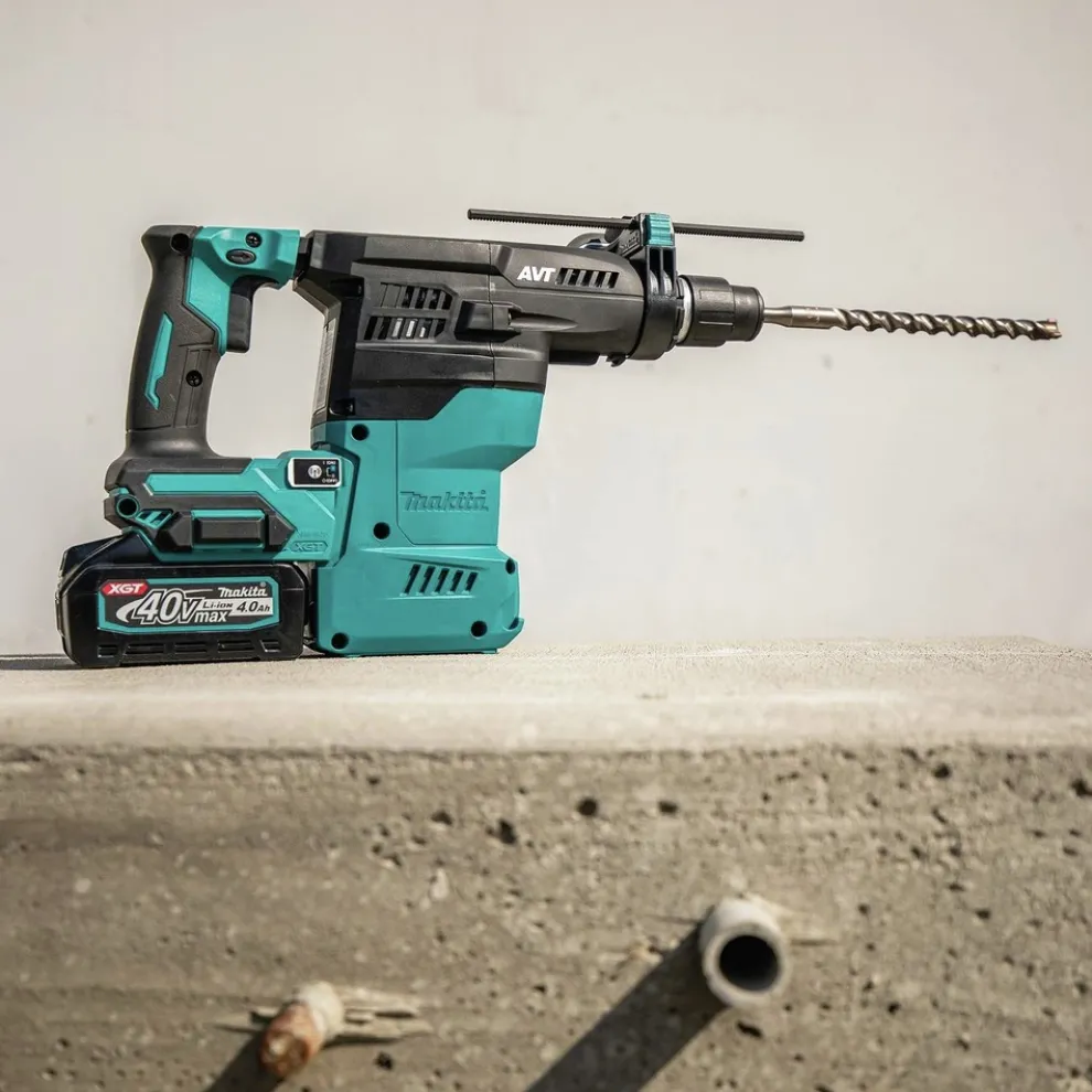 The 40V Max XGT Brushless Cordless 1-3/16 in. AVT Rotary Hammer Kit accepts SDS-PLUS bits, AFT, AWS Capable (model GRH08M1) is a cordless concrete solution designed for heavy-load applications. It delivers the power, speed, and run-time for corded demands, without the cord. The GRH08M1 is powered by a 40V Max Lithium-Ion battery with a Makita-built brushless motor that combine to deliver the power and performance required for heavy-load applications. It can deliver up to 135 of 3/8 in. Holes using a fully charged 40V XGT 4 Ah Battery. The variable speed dial and trigger enables user to match the speed to the application. This hard-hitting performance is combined with advanced comfort and convenience features including Active Feedback-Sensing Technology (AFT®), which electronically turns off the motor if rotation of bit is suddenly forced to stop. It is also equipped with Anti-Vibration Technology (AVT) for reduced vibration. More than just a padded handle, AVT is an internal counterbalance that uses air pressure to move counterweight pistons in the opposite direction of the drive piston to actively reduce vibration. In addition, the vibration-absorbing back handle and side handle are engineered to further reduce vibration. For added durability in harsh job site conditions, Extreme Protection Technology (XPT) is engineered for improved dust and water resistance.