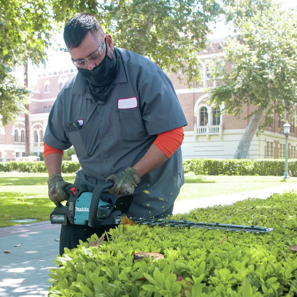 With zero emissions and lower noise, the 40V max XGT Brushless Cordless 24 in. Rough Cut Hedge Trimmer Kit (GHU01M1) is a welcome solution for professional landscaping clean-up applications. The Makita-built brushless motor delivers up to 4000 SPM for powerful trimming. It has three speed options to manage power and run time. The sharp-edged shear blade can trim through thick and hard branches. A reverse function clears jams. The hedge trimmer can get up to 3 hours of run time using one (1) 40V max XGT 4 Ah Battery. The 5-position rotating rear handle provides increased comfort during vertical and angle trimming. A tip guard protects the end of the cutter bar against hard surfaces.