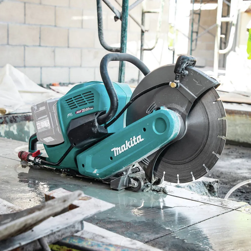 The 80V max (40V max X2) XGT Brushless 14 in. Power Cutter with AFT and Electric Brake (GEC01) has the power to cut through various masonry and metal materials with all the benefits and convenience of cordless operation. The 14 in. Wheel diameter allows for single pass cuts up to 5 in. Deep in various masonry and metal materials. Model GEC01Z is tool only, Batteries and Charger are sold separately. The benefits of a cordless power cutter over gas include no oil or mixing, lower noise, less maintenance, zero emissions, and no pull starts. This means instant starts, cost savings, and the ability to use the power cutter indoors. It has an integrated water delivery system with a water flow adjustment knob that continuously feeds water for OSHA Table 1 Compliance in concrete cutting applications. The belt-drive design provides smoother operation with lower vibration. The GEC01 has a Makita-built brushless motor combined with (2) 40V max XGT batteries to deliver the performance equivalent to a 75.6cc gas-powered model. The brushless motor runs cooler and more efficiently for longer life and can deliver up to 5300 RPM.