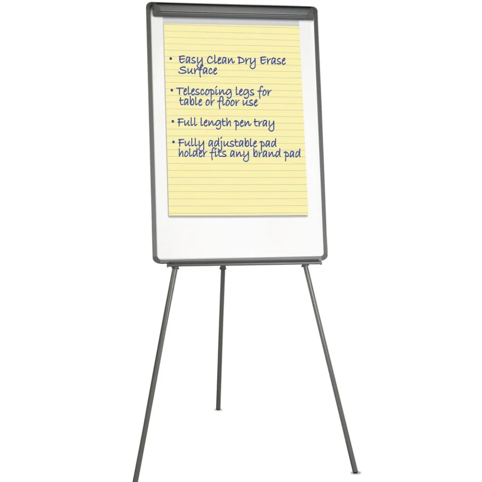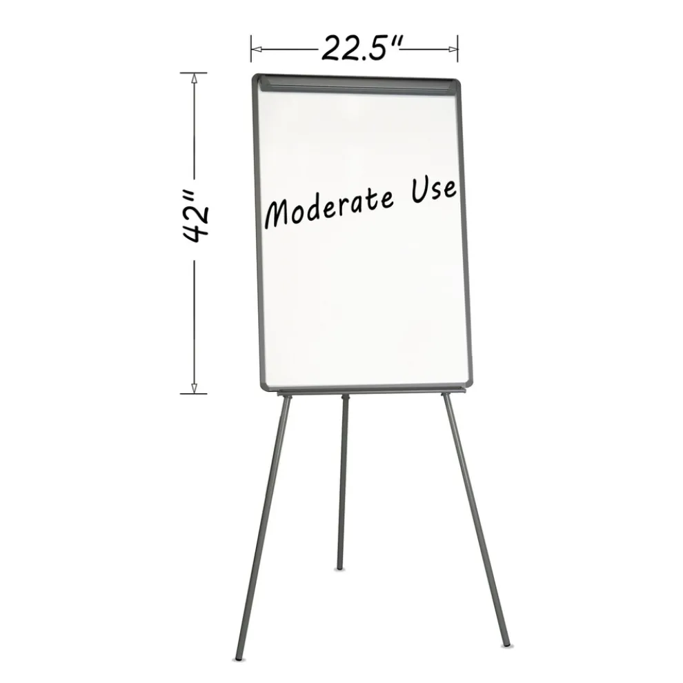 The economic Tri-Pod Presentation Easel matches value with performance and features a traditional 3 leg design. Height adjustable, to be used on either the floor or a table. The nonmagnetic melamine surface has an aluminum frame and is suitable for moderate use. Equipped with a generous full length marker tray, it holds any size of easel pad with its no pinch pad retainer. It is constructed with a lightweight adjustable tubular frame that folds flat for easy storage.