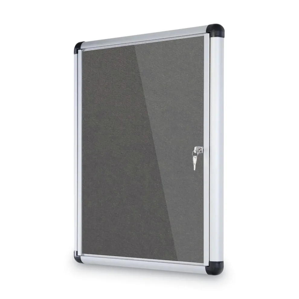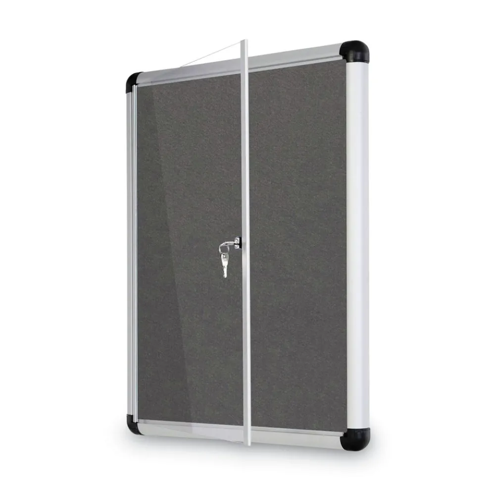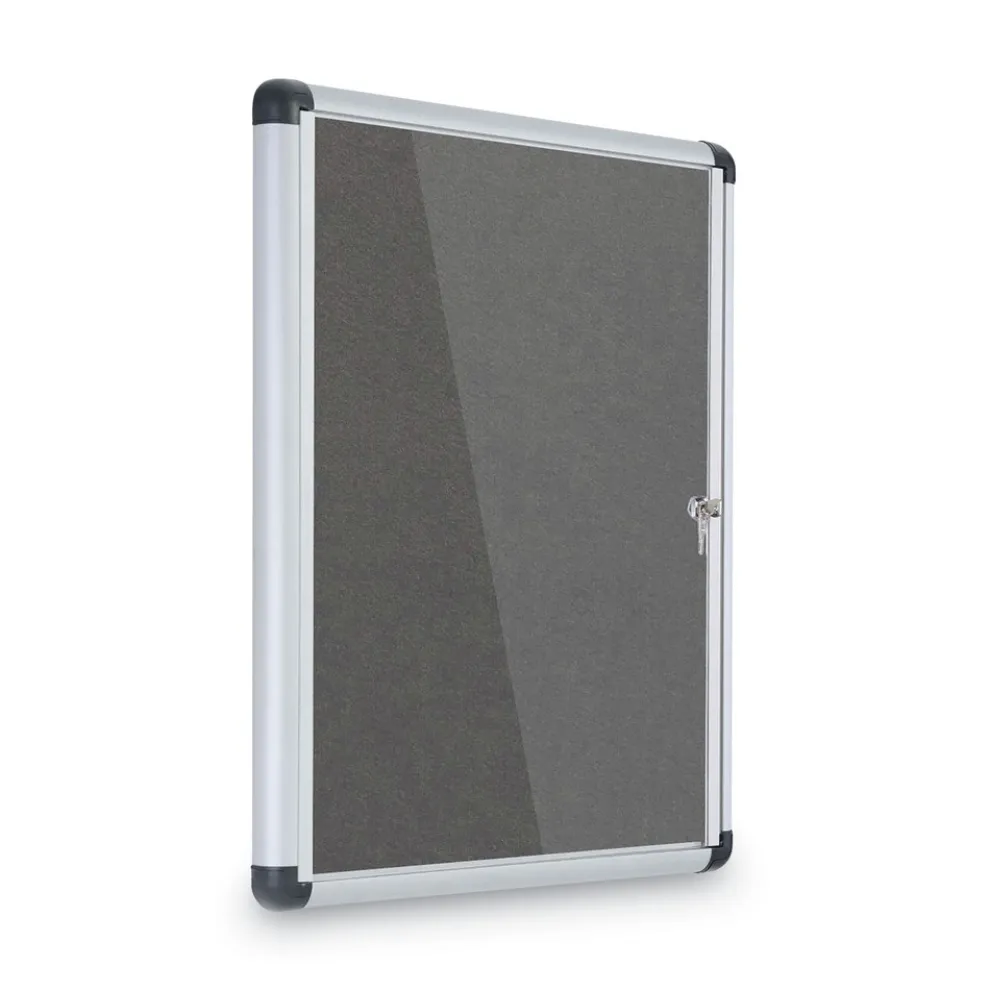 Enclosed boards showcase information in a beautiful way. These ultra slim formats allow perfect visibility without any obtrusion into walking spaces. Easy to hang with a locking swing door. Perfect for menus, schedules, timetables and other vital postings. The gray fabric bulletin surface creates an attractive contrast to documents that are displayed. Easy four corner mounting with hardware included.