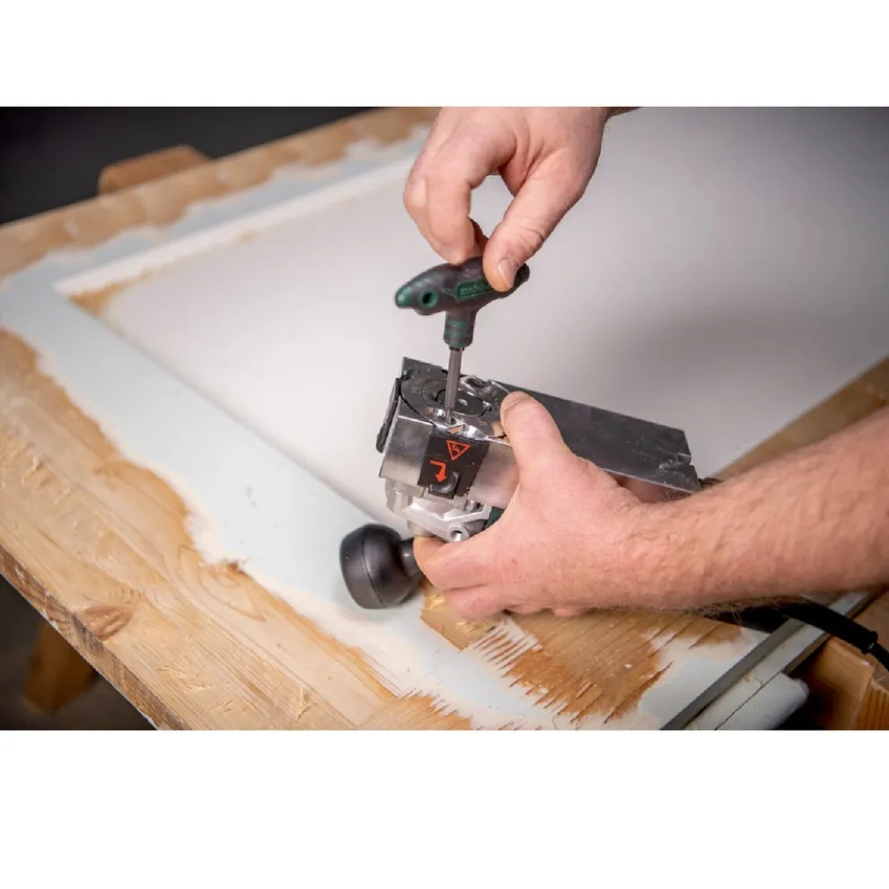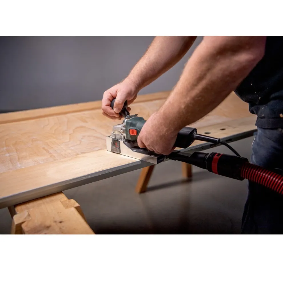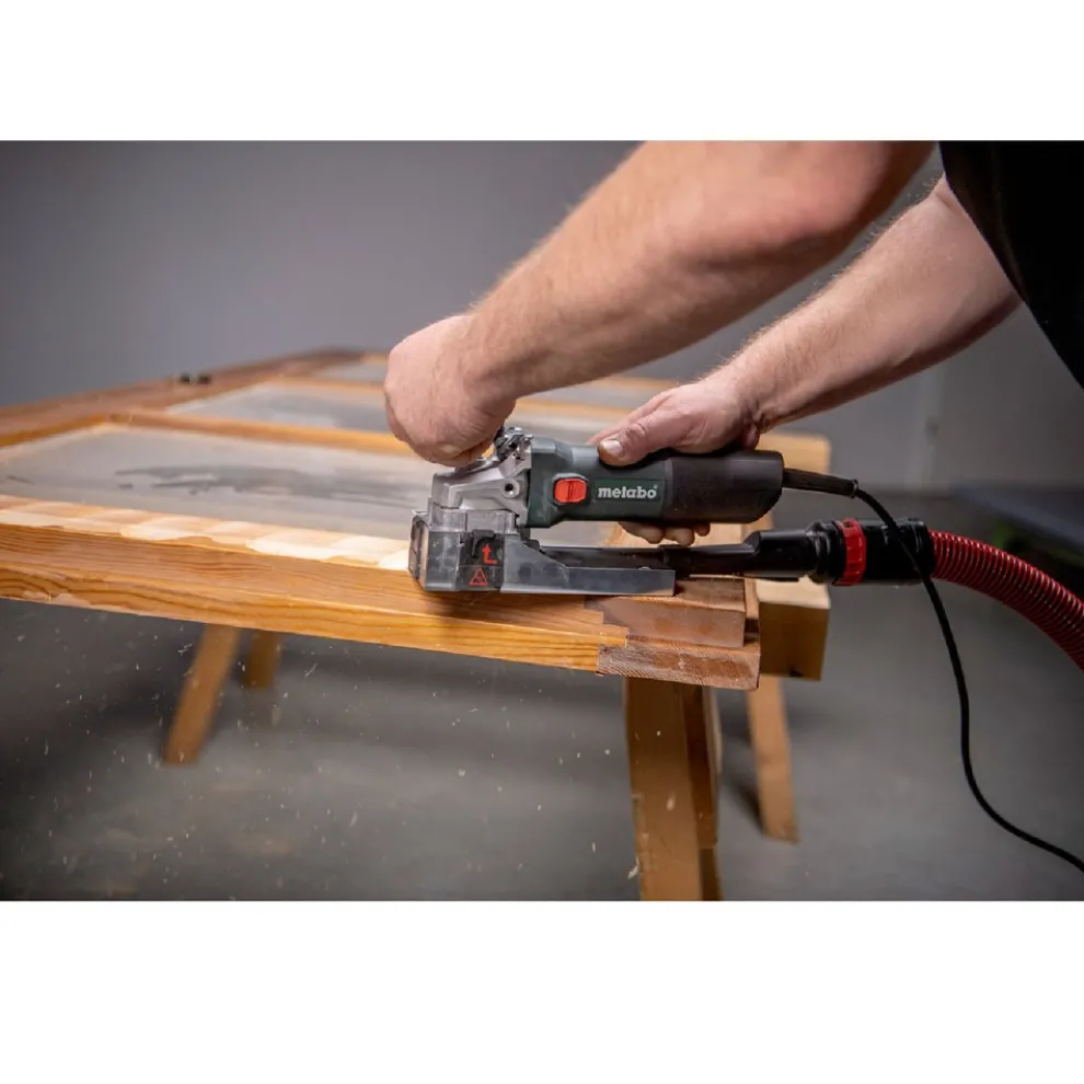 The Metabo Corded Paint Remover is a problem solver for renovation work. Engineered and manufactured in Germany. This powerful tool saves up to 70 percent of time when compared to conventional working methods and is best suited for processing untreated wood and removing paint and varnish from surfaces such as stairs, doors and windows. The adjustable milling depth and lateral reversible carbide blades allow for processing notches, and the Die Cast aluminum gear housing provides optimum heat dissipation and durability. The included extraction connector offers the connection to an all-purpose vacuum cleaner for dust removal and a cleaner work environment. The tool comes in a metaBOX 145 and the package contains (4) reversible carbide blades, (1) extraction connector, (1) adjusting wrench with handle, and (1) combination wrench.