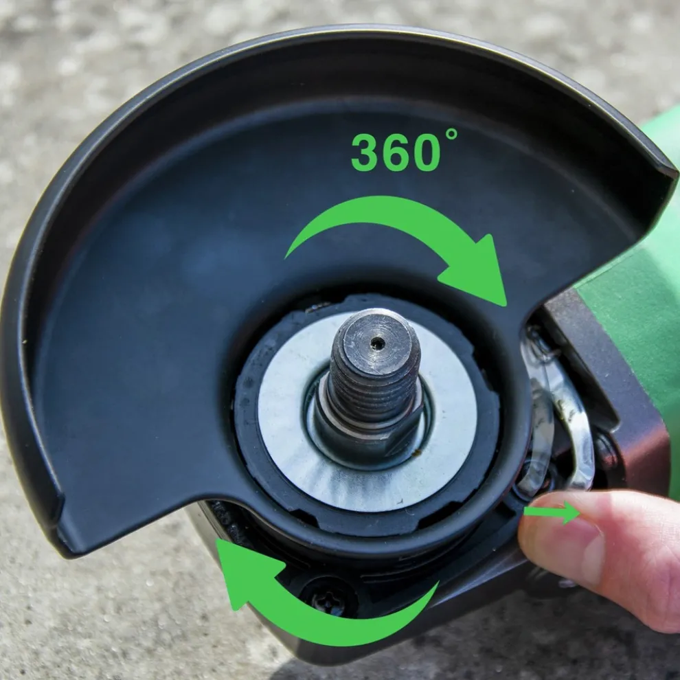 The brushless motor is ultra efficient and permits the use of extra long extensions cords without reducing power loss, extends product life and eliminates maintenance of armatures or carbon brushes. A tool-less wheel guard and 3 position side handle provide the user increased operational efficiency. An anti-vibration side handle is included for user comfort. A removeable dust filter offers additional protection for the motor against dust and debris, ensuring the tool is operating effectively as desired. Superior performance is achieved when using a generator via an internal inverter circuit that regulates uneven power supply.