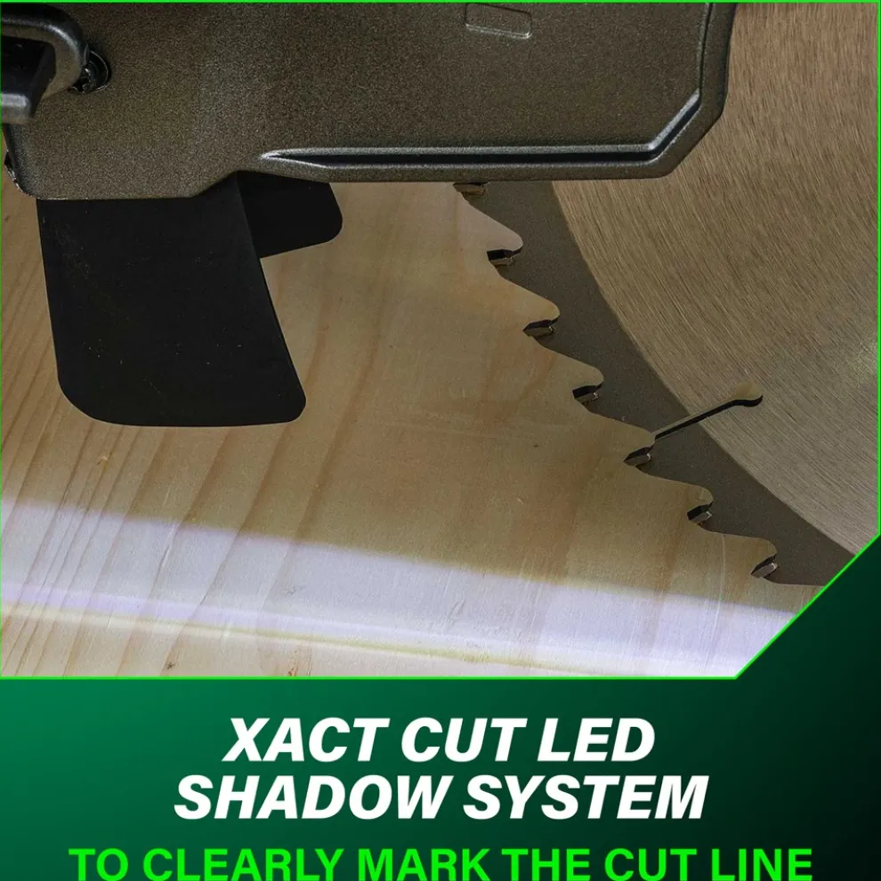 Dual bevel sliding miter saw with 4,000 RPM speed, LED shadow line, and 9 detent stops.