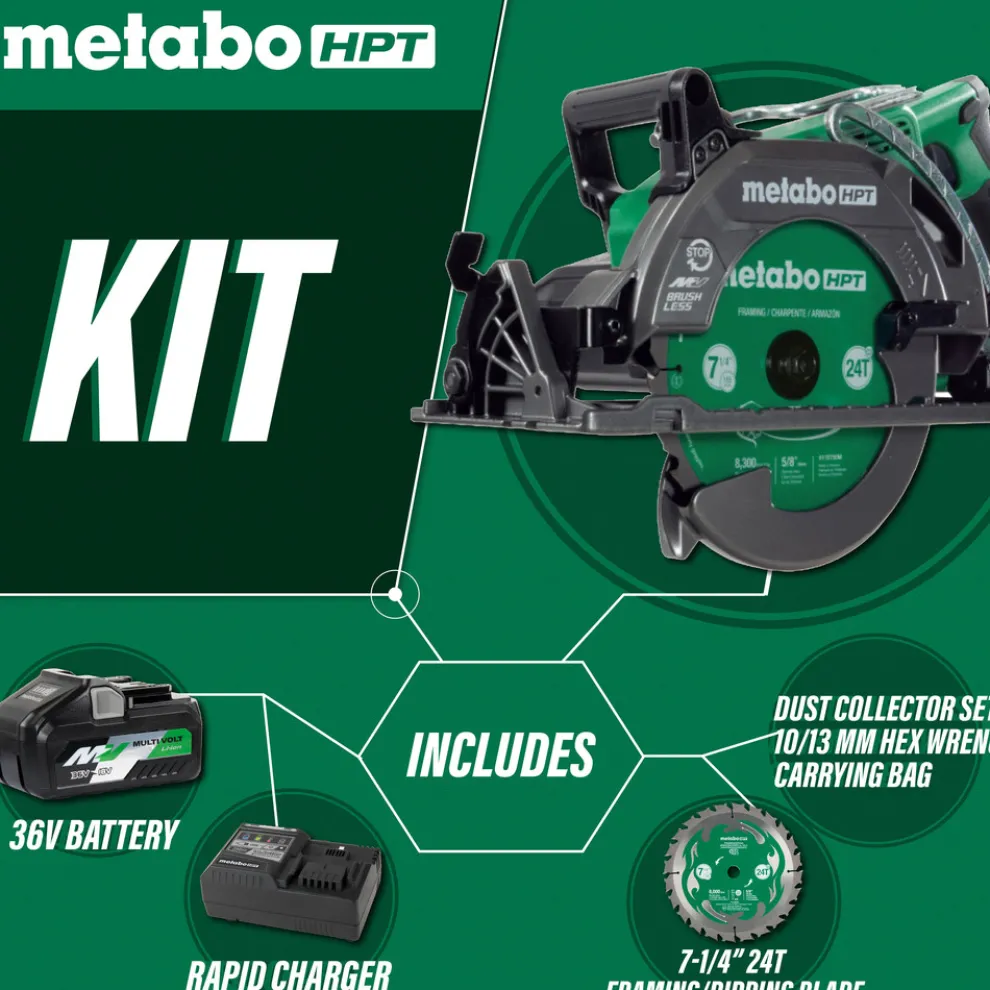 This 36V MulitVolt 7-1/4 in. cordless rear handle circular saw includes the new VPR 24 tooth framing blade and a convenient tool bag. This saw is backed by Metabo HPT’s Lifetime Lithium-ion tool body warranty, providing peace of mind for your purchase. This 36V rear handle circular saw is part of the expanding MultiVolt system of power tools from Metabo HPT. It accepts any MultiVolt battery for extreme power and runtime and can also accept the unique AC adapter (ET36A) to plug in for all day runtime, offering ultimate versatility and power on the GO.