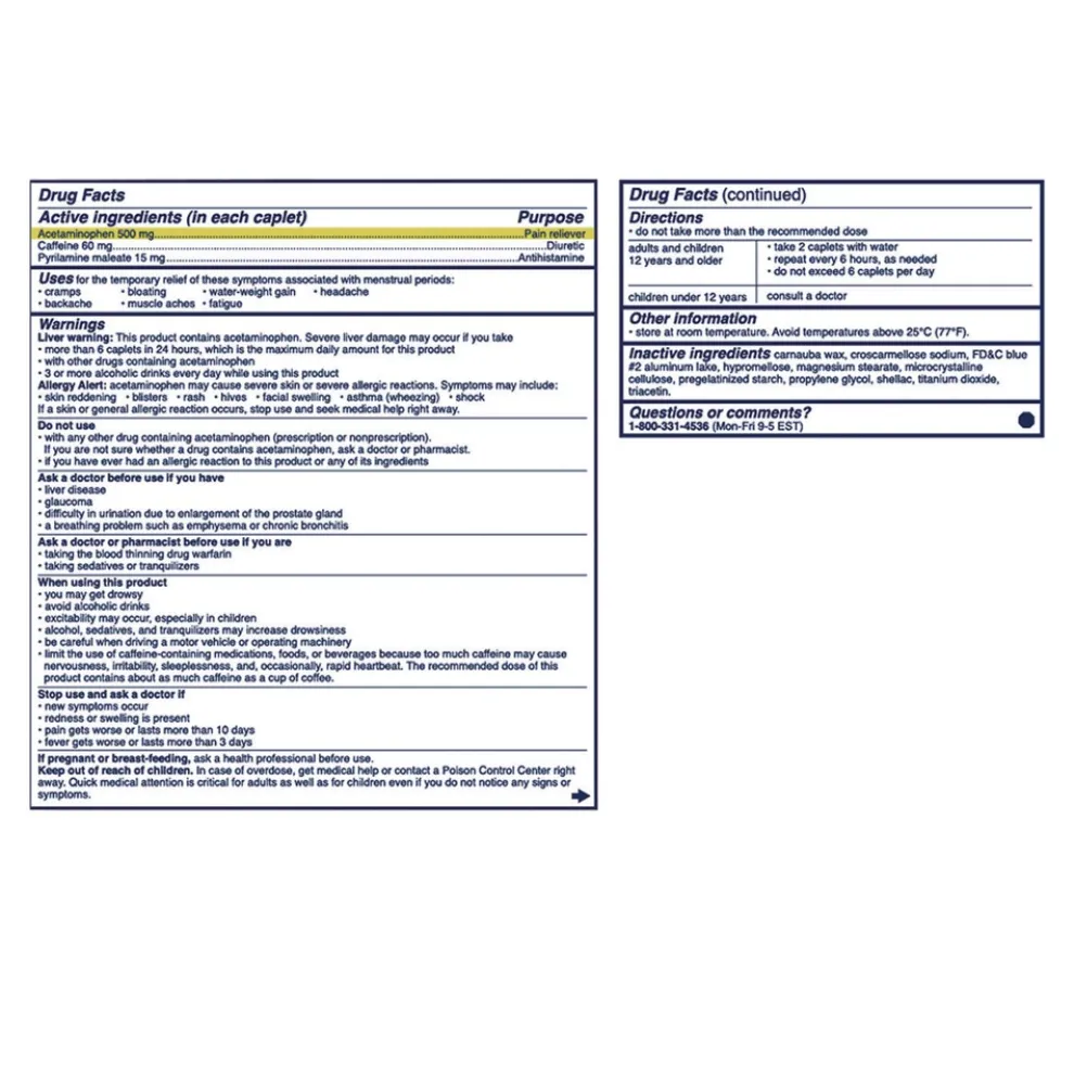 Don’t suffer – choose a reliable medication that relieves many of the pesky symptoms that come with your period. A unique combination of medicine will get you going in no time. Maximum strength acetaminophen relieves pain, while a diuretic helps relieve bloating and caffeine helps fight fatigue. Packaged for individual use; great for use in replenishing first aid stations and kits.