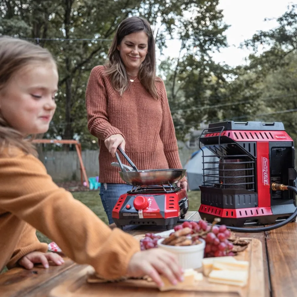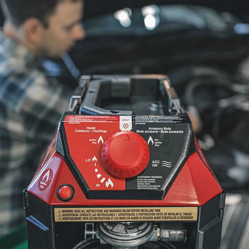 The 11000 BTU High Performance, Omni-Directional Mesh Burner provides high-intensity radiant heat in a full 180 Degree spread so everyone can enjoy the warmth! With integrated gas-powered accessory controls and a quick-connect accessory rail system, you’re safe and ready to go in any weather conditions and any event. Mr. Heater’s Trusted – Advanced Safety Detection Systems, including; Emergency Low Oxygen Safety System, Apex 50 Degree Tip-Switch, and Thermal Shut-Down System, you and your family are safe. You asked and we listened. We updated our design to feature an optimized wind barrier and pilot shield for maximum protection when used outdoors. Left and Right side accessory doors feature a battery compartment and Gas Accessory Quick Connect Port. The opposite door includes a multi-purpose storage compartment for gloves, documents, power cords, or a fishing tackle box.