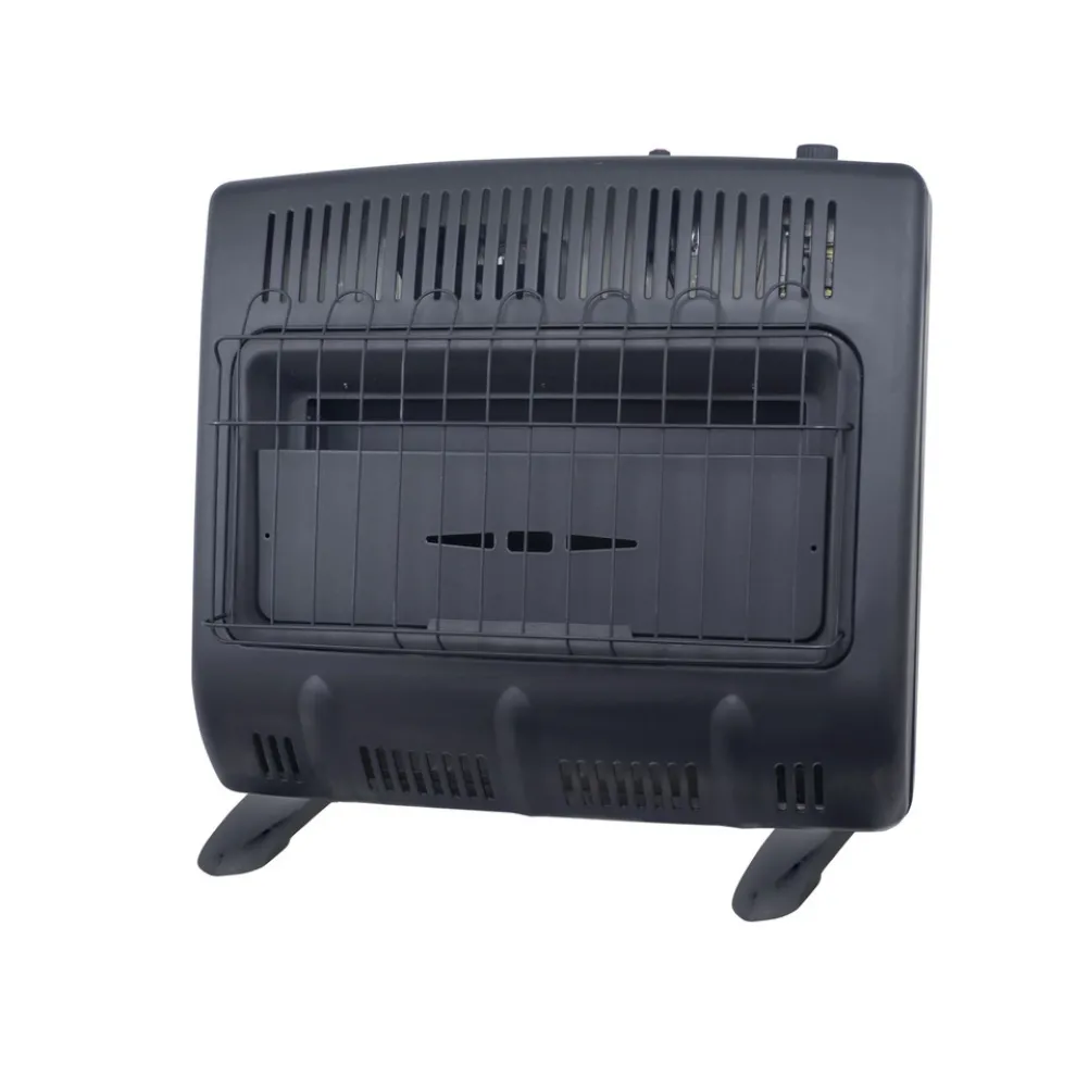 This 30000 BTU Liquid Propane Garage Vent Free heater is the perfect heating solution for your workshop or garage. The glass on the standard vent free unit has been replaced with a metal heat shield for added durability. This heater is conveniently equipped with a thermostat for superior control of the temperature in your work or storage space. Also, with a battery powered electronic ignition, starting it is a breeze – battery included. This unit can be permanently mounted to the wall or securely fastened to the floor with included mounting brackets and fasteners. A clean burning blue flame tube burner uses the natural convection of the burn to circulate warm comfortable air keeping your tools and toys safe and warm. With a factory standard Oxygen Depletion Sensor (ODS), rest assured this heater will provide you with years of comfortable and safe heat.