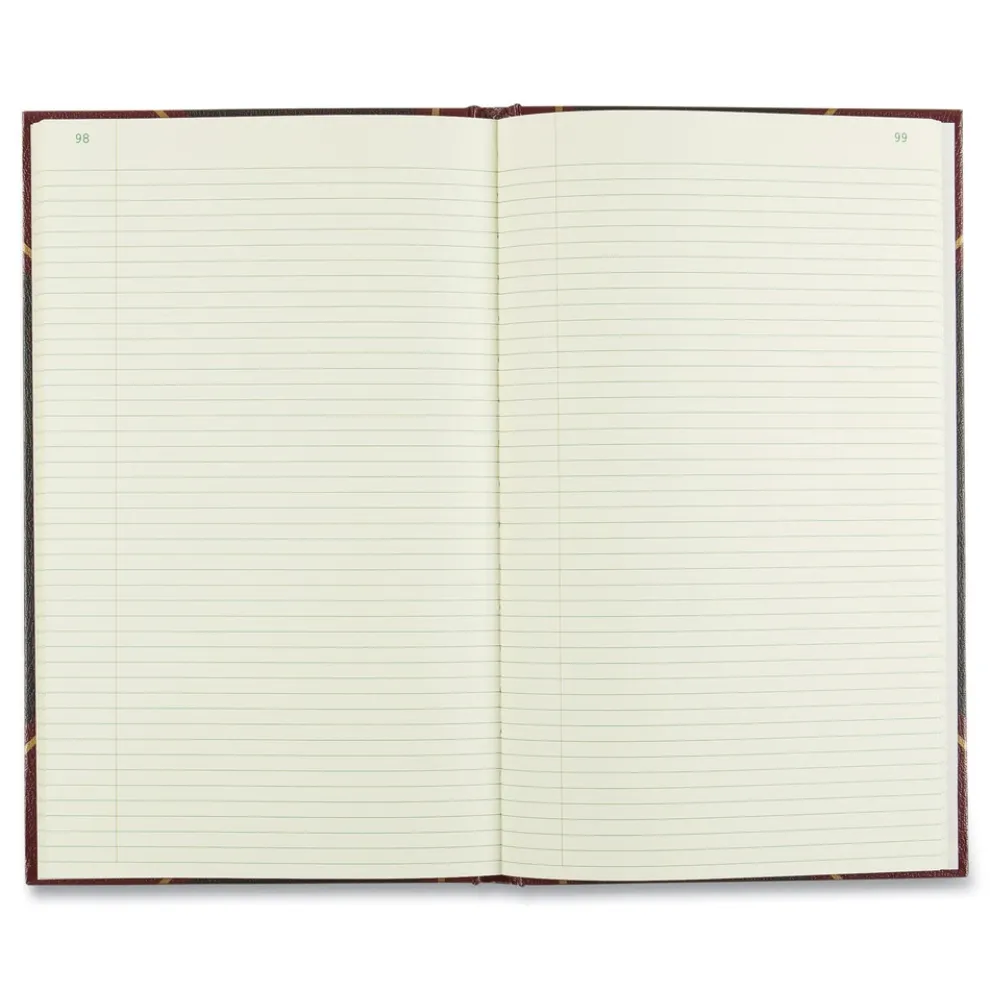 Record book features the classic look of black leather cover with burgundy spine and corners. Faintly ruled pages have margin line. Includes a ribbon bookmark.