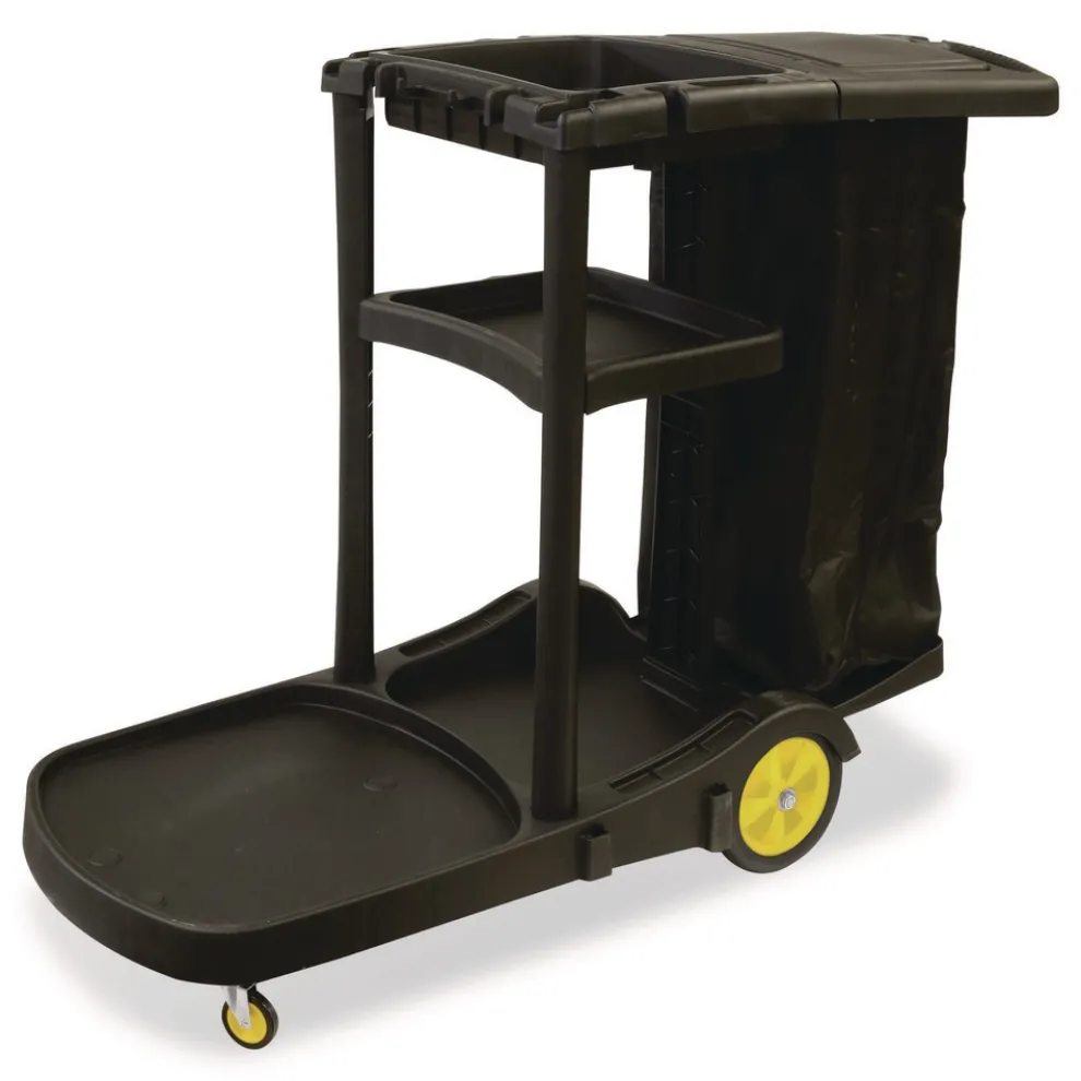 Sleek and modern janitor cart maneuvers easily in confined areas.