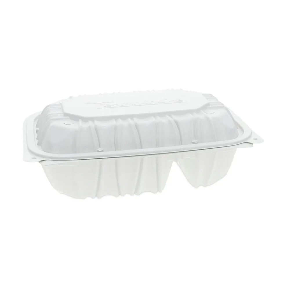 Pactiv Corp. YCNW02052 2-Compartment 9 x 6 x 3.1 EarthChoice Vented Microwavable MFPP Plastic Hinged Lid Container – White (170/Carton)