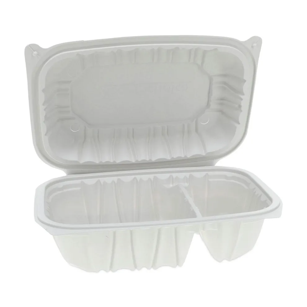(170/Carton) 2-Compartment 9 x 6 x 3.1 EarthChoice Vented Microwavable MFPP Plastic Hinged Lid Container – White – YCNW02052