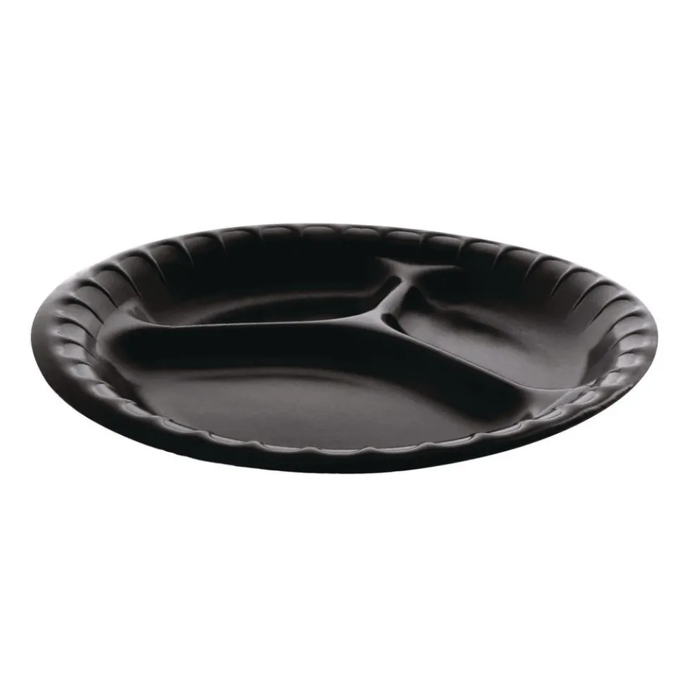 (500/Carton) 9 in. Diameter 3-Compartment Placesetter Deluxe Laminated Foam Dinnerware Plate – Black – YTKB00110000