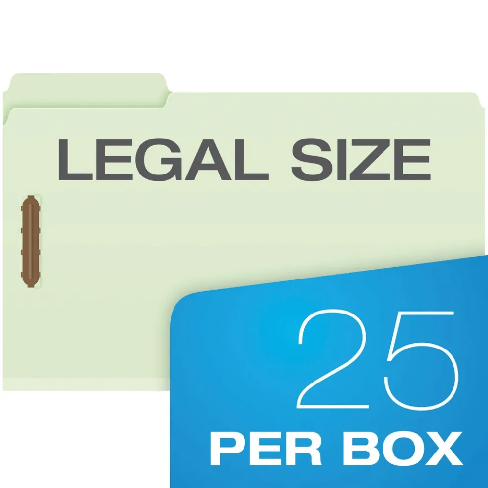 Pendaflex 17186 1/3-Cut Tabs 2 in. Expansion 2 Fasteners Legal Size Heavy-Duty Pressboard Folders with Embossed Fasteners – Green (25/Box)