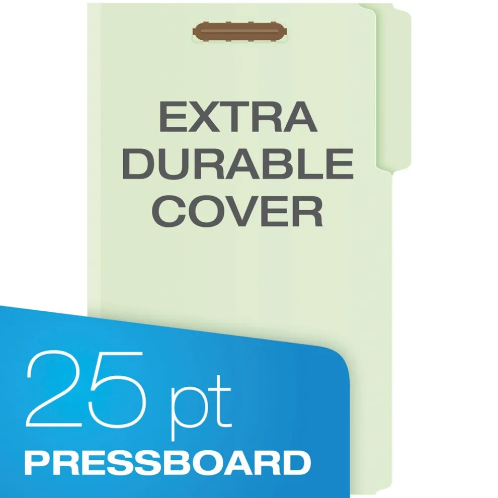 Extra heavy-duty 25 point pressboard provides outstanding durability, safeguards paperwork – ideal for frequently accessed files. 2 in. capacity prong fasteners embossed into front and back covers holds papers firmly in place. Rip-proof tape reinforced gussets.