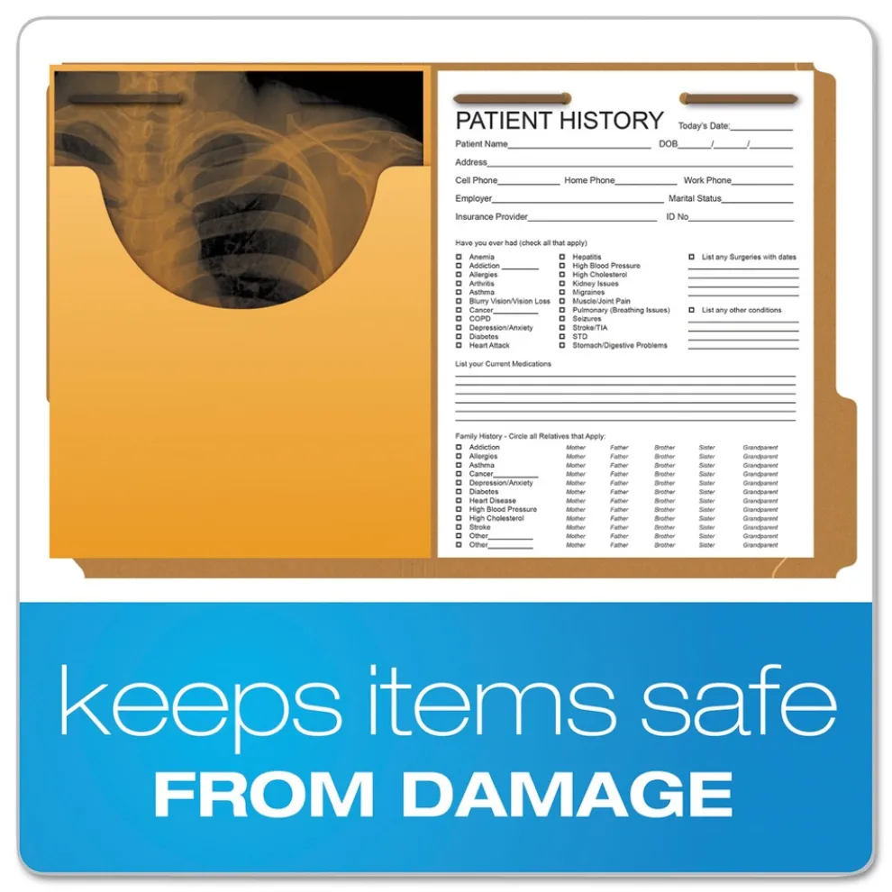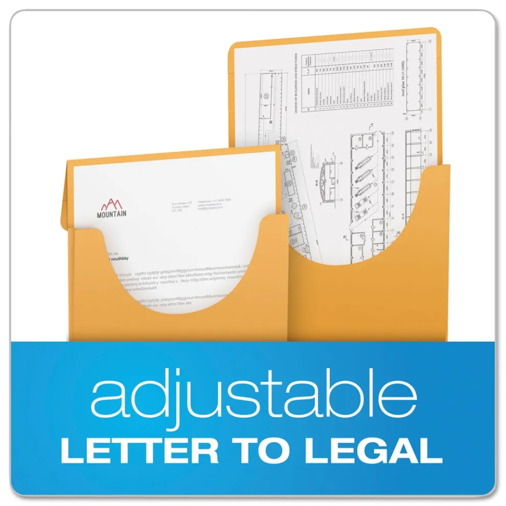 Retains important files safely and securely! Big 9 in. pocket keeps documents, photos, CDs and more secure. No need for hole punching. Keeps items of varied sizes neatly organized in one easy-to-find place. Double-ply top. Pre-drilled to attach instantly to fasteners. Expansion allows more room as materials are added. Score line for simple conversion from letter to legal size.
