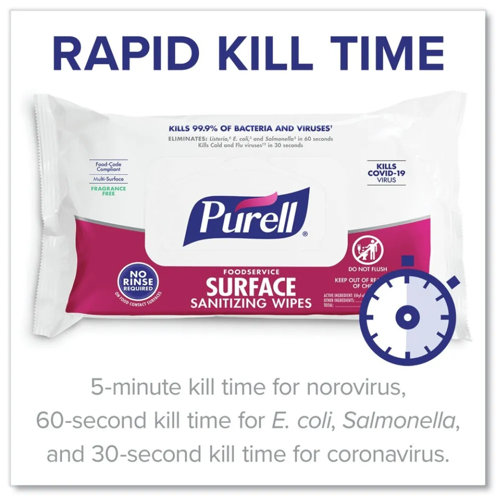Formulated for food-contact surfaces with no rinse required, simplifying the cleaning and sanitizing process to meet foodservice needs. Kills 99.9% of viruses and bacteria. Meets EPA 60-second sanitization. Sanitizes, cleans, and disinfects. Convenient, ready to use wipes require no mixing.
