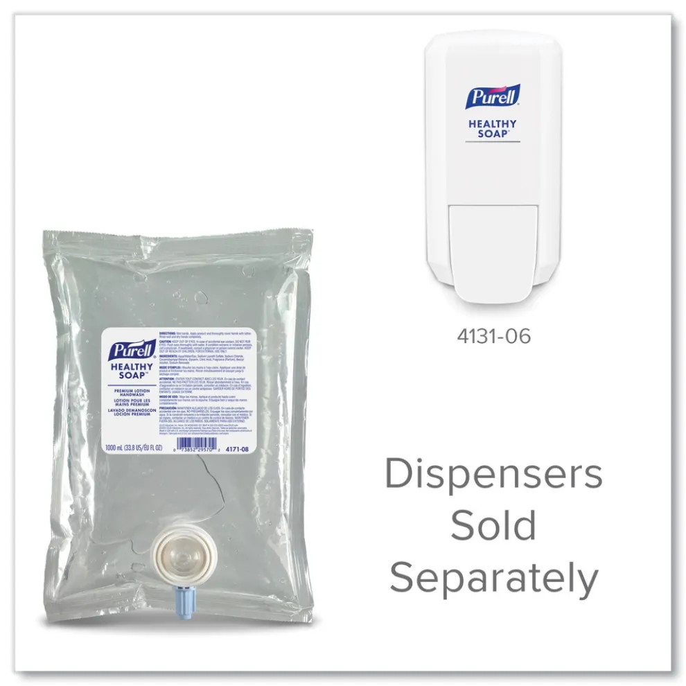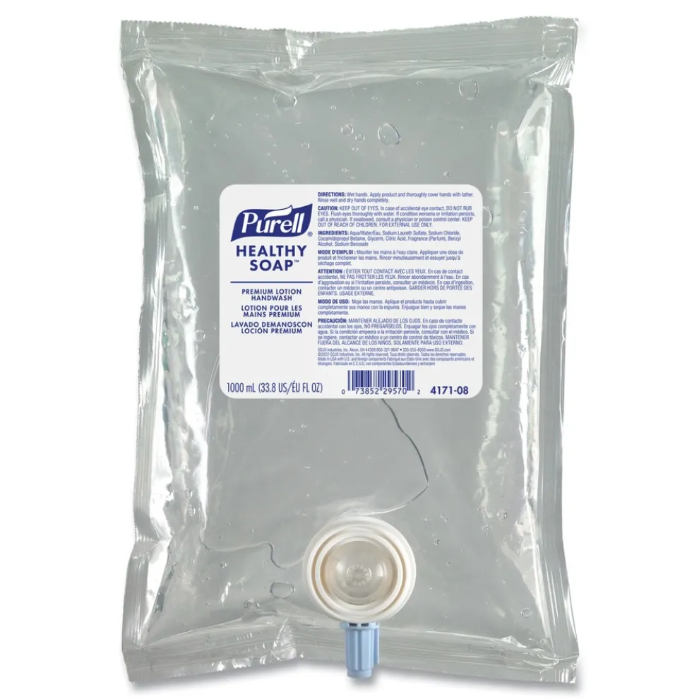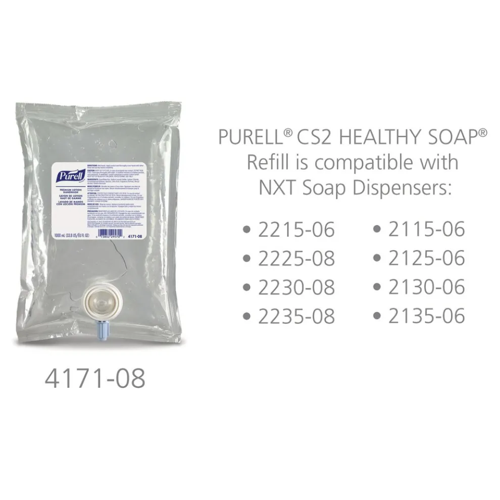 Show you care for employees and visitors with PURELL HEALTHY SOAPâ„¢ Premium Lotion Handwash. As a high-performance, gentle lotion soap designed for general handwashing, this formula is mild enough to use repeatedly throughout the day. Because the formula is triclosan-free, it won’t dry out or irritate skin. The formula is dye-free with a waterfall fragrance and gently removes dirt and germs from hands. Each refill is SANITARY SEALEDâ„¢ to help prevent contamination and includes a fresh dispensing valve. These 1000 mL refills work with the PURELL CS2 Manual Hand Soap Dispenser (sku 4131-06, sold separately). This CS2 soap refill is also compatible with NXT Dispensers (2215-08, 2225-08, 2230-08, 2235-08, 2115-06, 2135-06, 2125-06, 2130-06); NXT dispensing platform is being discontinued.