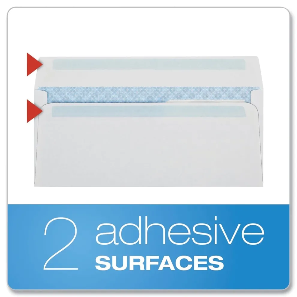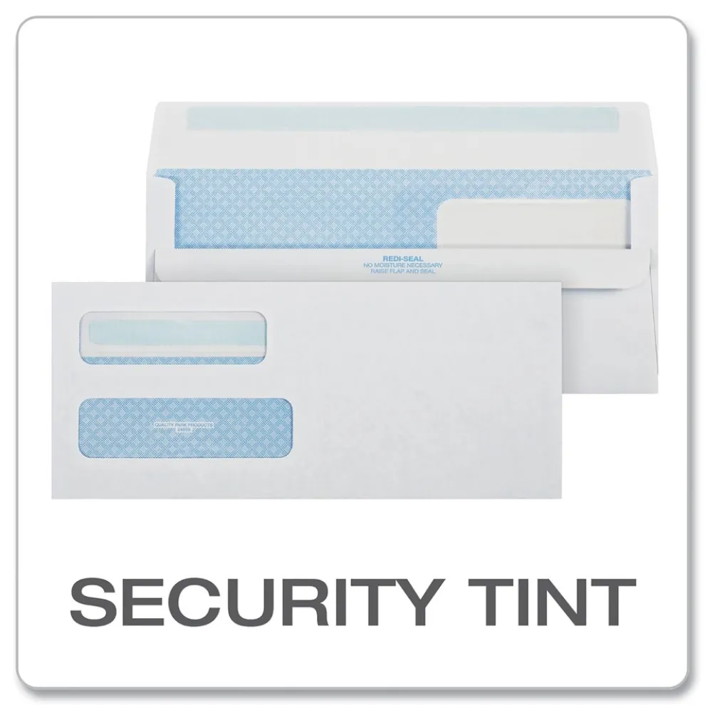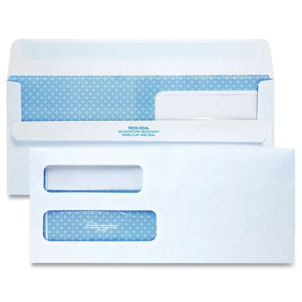Quality Park Double Window Envelopes display both sender and receiver addresses for mailing statements and invoices. Features a special Redi-Seal self sealing closure. Simply lift the bottom flap and press to the top flap for an instant, secure seal. A reflex blue pattern protects sensitive client information because it obscures the details of the contents, even when held up to light. These 24 lbs. white wove envelopes have side seams for a clean, professional look.