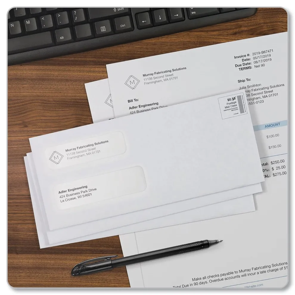 Double window envelopes display sender and receiver addresses for invoices and billing statements