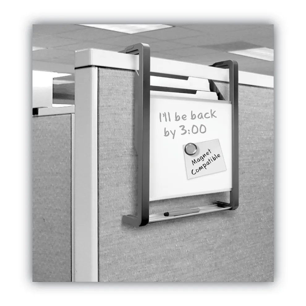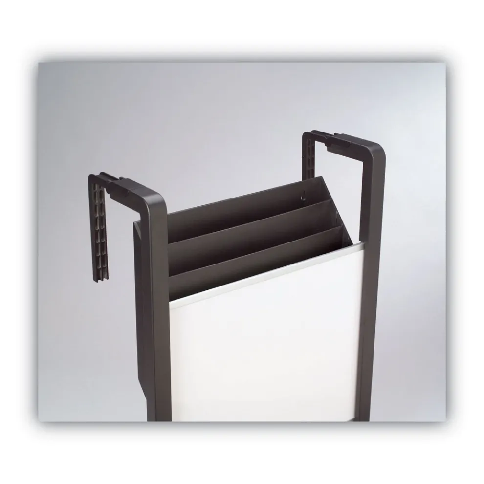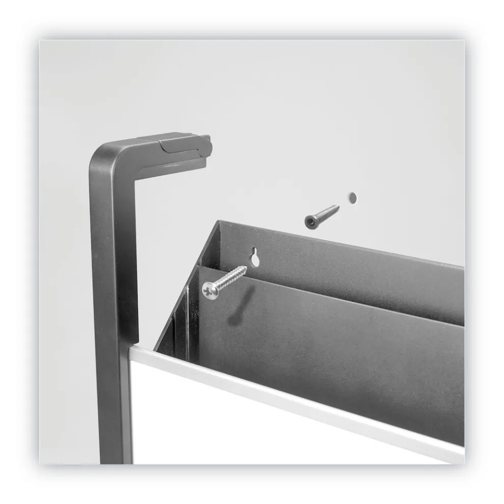 Dual-purpose, three-pocket vertical filing system with built-in 11 in. x 13 in. magnetic whiteboard allows you to broadcast information and efficiently manage paper flow in your personal workspace. Two removable partitions convert the file pockets into one, two or three letter-size compartments. Hangs over most cubicle panel systems and mounts onto dry-wall surfaces. Built-in marker tray. Includes mounting hardware.