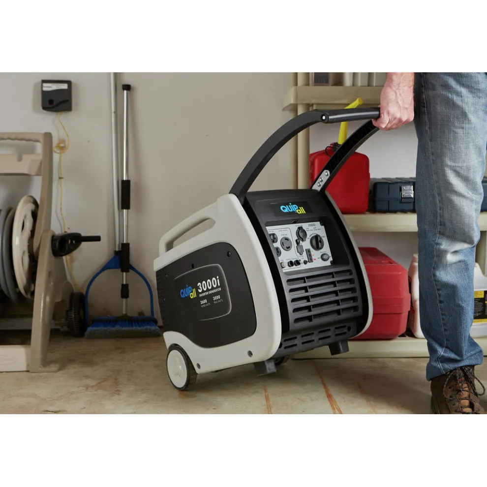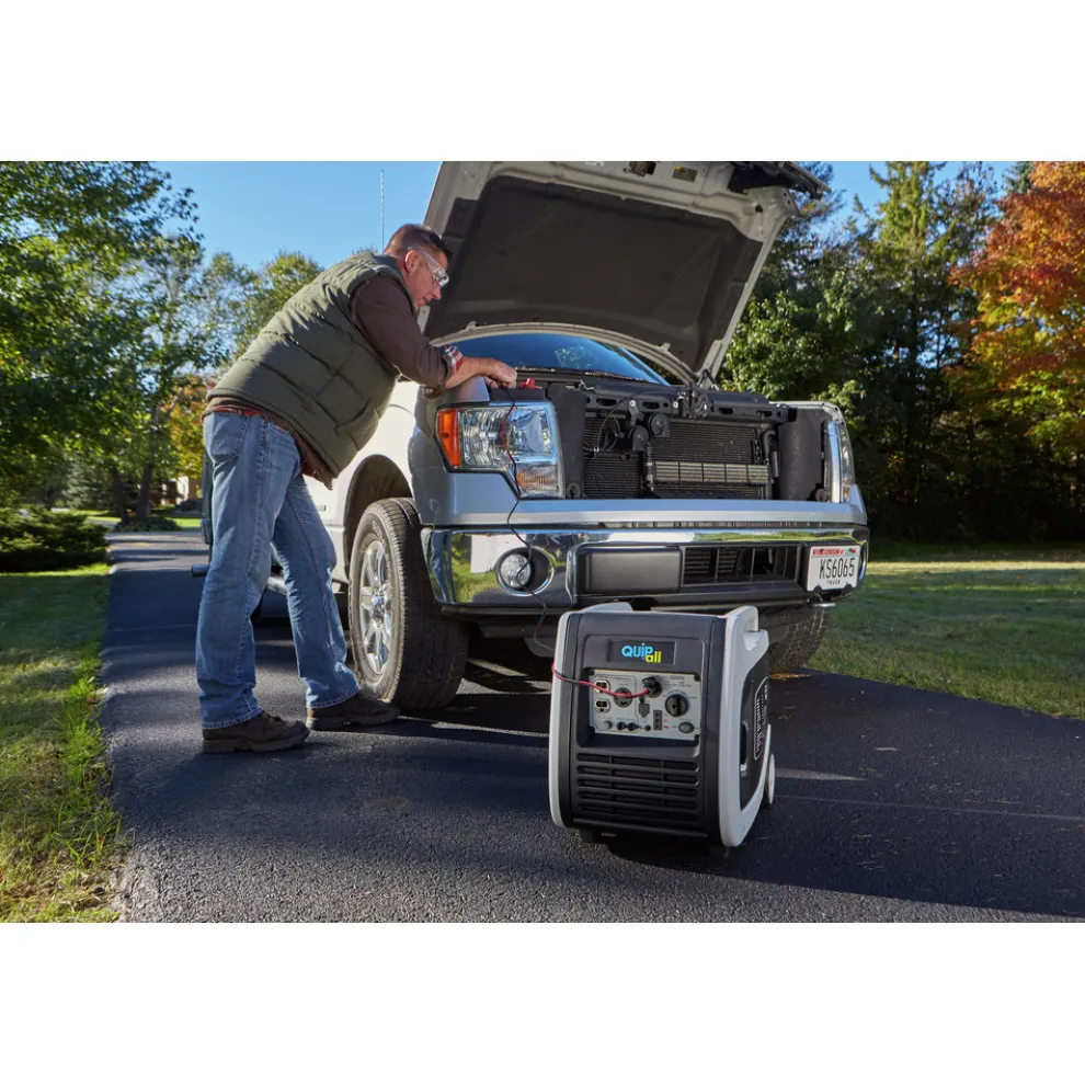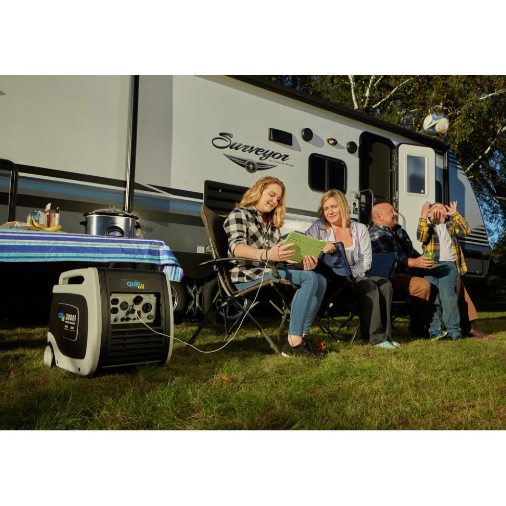 The Quipall 3000i Inverter Generator provides go-anywhere power for camping, tailgating, RV living, jobs around the yard or to keep the refrigerator running and lights on in a storm. It’s quiet, thanks to its inverter engine technology, producing a fraction of the sound you get from a standard generator. Built to last, its durable 212cc engine produces a rated output of 2600 watts and a maximum power of 3000 watts. The smart throttle system automatically adjusts power output to the connected load, conserving gasoline and allowing the unit to run even quieter. There are outlets to meet all of your power needs: two 120V outlets, one 30 amp RV twist-lock receptacle, a 12V DC outlet for charging automotive batteries and a USB outlet to charge your tablet, cell phone and other devices. The Quipall 3000i Inverter is easy to operate and has built-in safety features, including low oil alert with automatic shut-down to protect the engine, an engine overload indicator light and integrated overload protection. The unit has parallel capability with another Quipall Inverter to give you even more power without giving up easy portability.