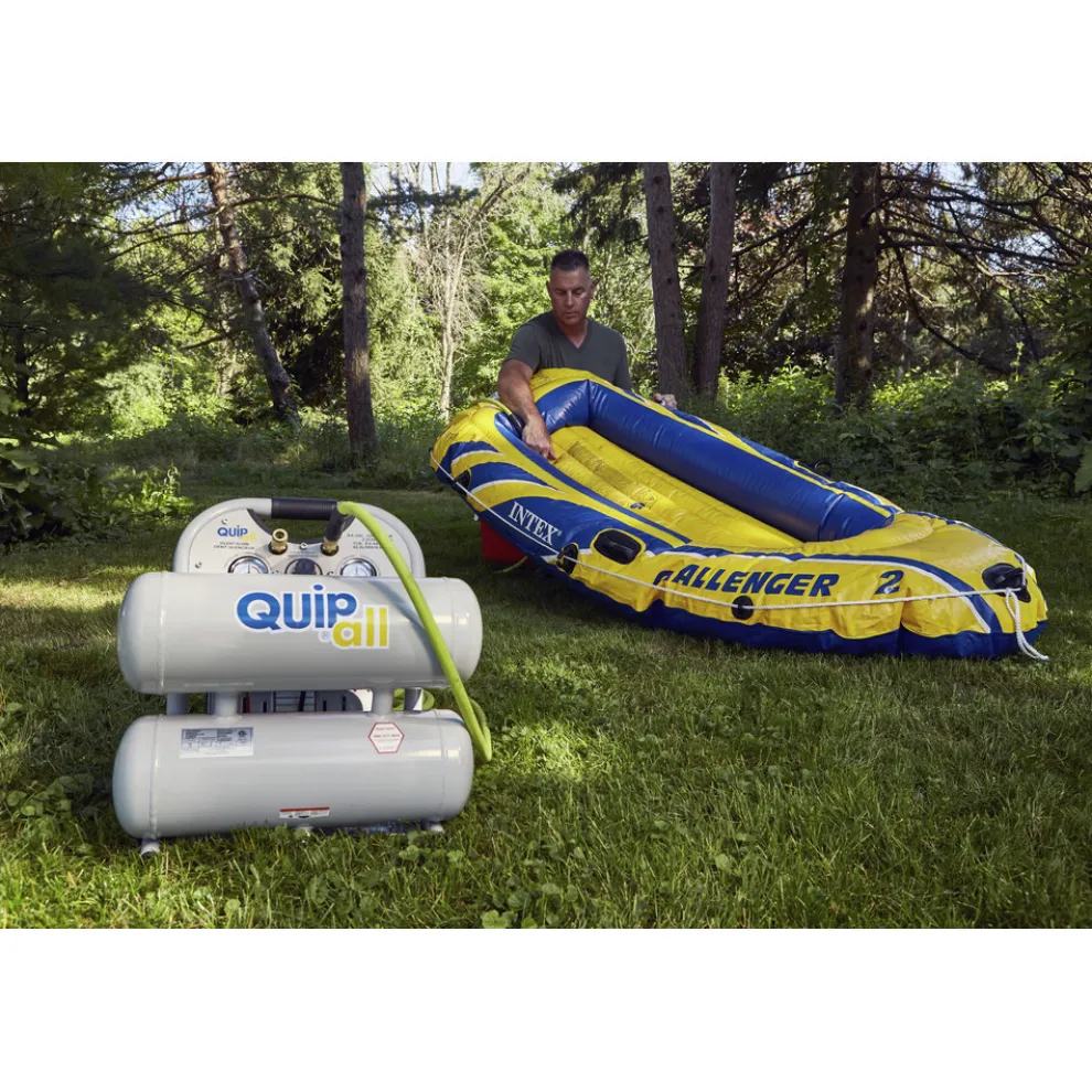 The Quipall 4.6 Gallon, 1 HP Aluminum Twin Stack Ultra Quiet, Oil Free Compressor gives you the air capacity you need to easily finish those hobby projects and chores. It’s ultra-quiet at only 62 decibels allowing you to carry on a conversation or listen to music while working. The durable, oil-free pump never needs maintenance, and the induction motor has a working life that’s three times longer than a traditional compressor motor. The 4.6 gallon aluminum twin-stack tanks deliver 3.2 CFM at 40 PSI and 2.2 CFM at 90 PSI, with a maximum working pressure of 125 PSI. It’s the ideal compressor for hobby projects, inflation and more. An easy-to-read control panel and two quick-connect couplers let you work efficiently, while the integrated, easy-carry handle lets you move the compressor where you need it.