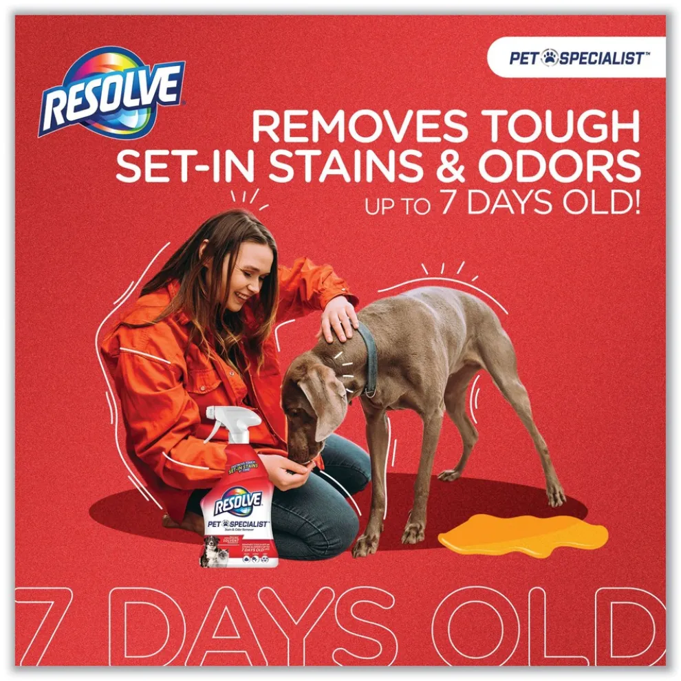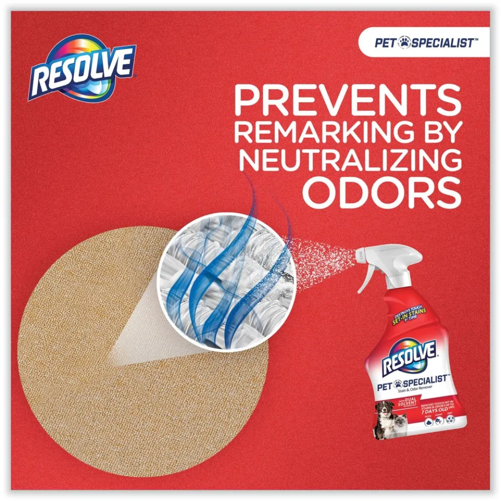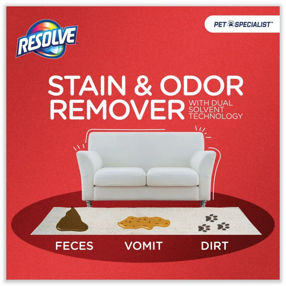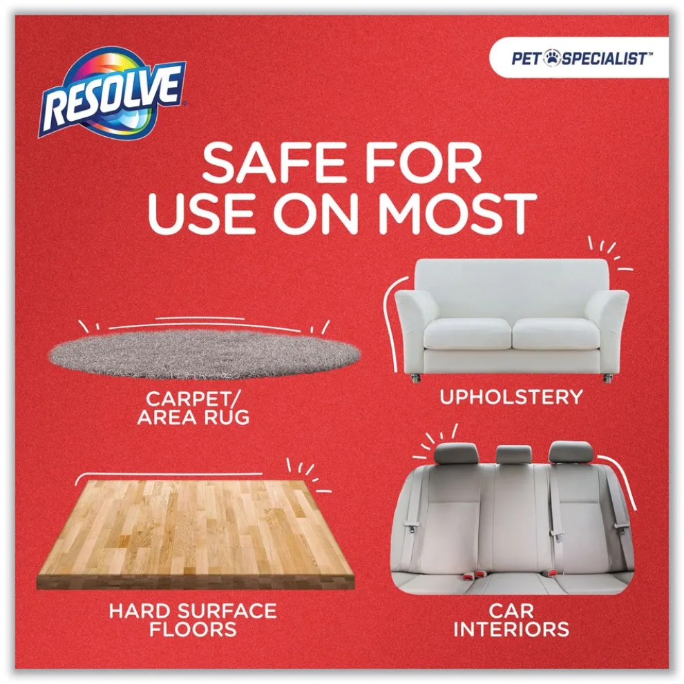 RESOLVE Pet Specialist Stain & Odor Remover lifts and removes tough set-in stains like feces, vomit, dirt and their odors up to seven days old. Also prevents remarking by neutralizing odors. It’s safe for use around pets when used as directed. This formula makes carpet, floor and upholstery cleaning super easy! It destroys tough set-in stains the first time and it is safe to use on most carpet, rug, upholstery, hard surface floors and car interiors.
