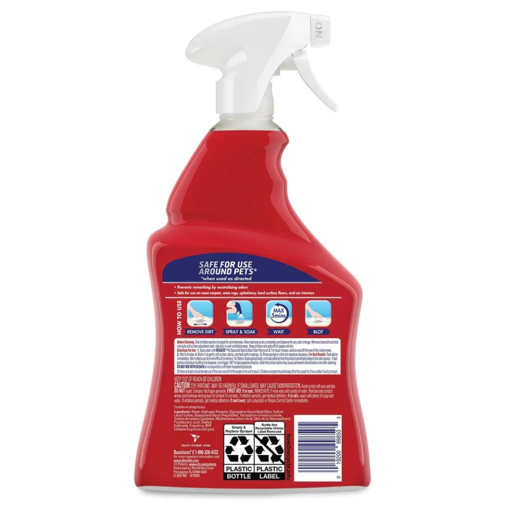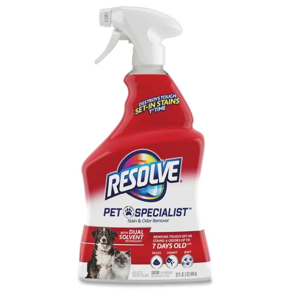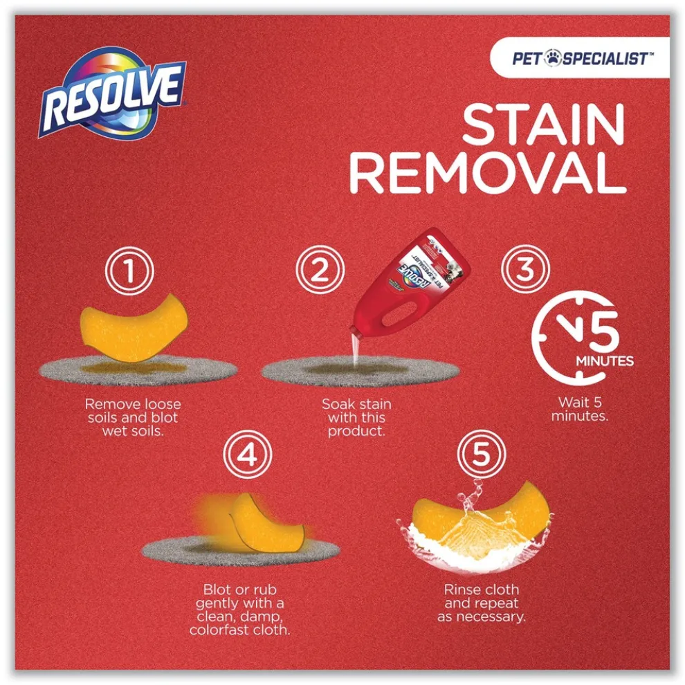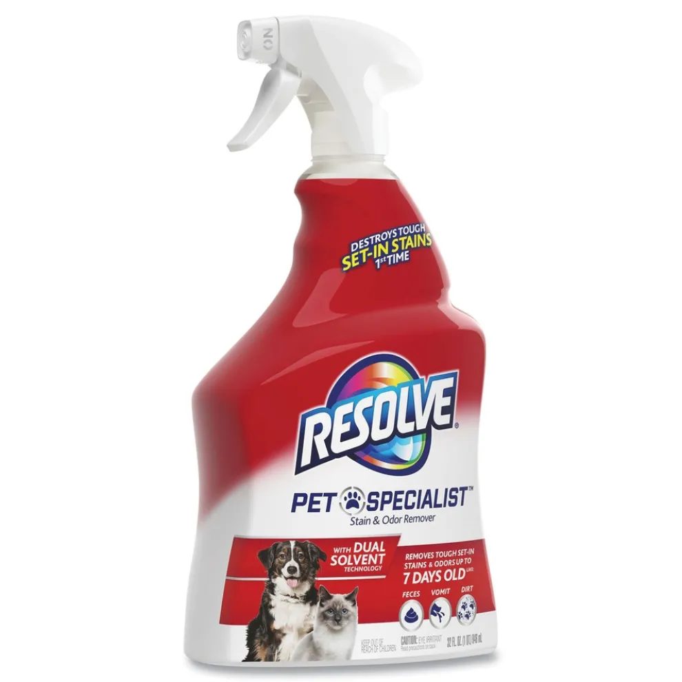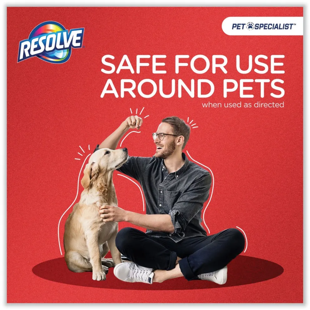 RESOLVE Pet Specialist Stain & Odor Remover lifts and removes tough set-in stains like feces, vomit, dirt and their odors up to seven days old. Also prevents remarking by neutralizing odors. It’s safe for use around pets when used as directed. This formula makes carpet, floor and upholstery cleaning super easy! It destroys tough set-in stains the first time and it is safe to use on most carpet, rug, upholstery, hard surface floors and car interiors.