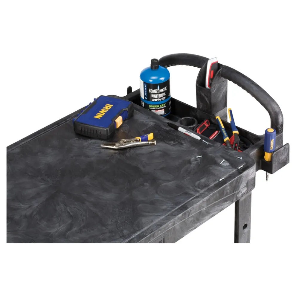 The Rubbermaid Commercial Heavy-Duty Utility Cart, 2 Shelf, Medium, is constructed of sturdy structural foam that will not dent, chip, or peel. 2 shelves support up to 500 lbs. of materials throughout the facility. Crafted with ergonomic handles for perfect hand placement, this rolling cart has rounded corners to protect walls and furniture and 4″ non-marking swivel casters for lightweight maneuverability. With molded handle compartments for additional storage, molded fittings for rolled supplies and easy-access top and bottom shelves, this is a versatile and indispensable utility cart for any facility.