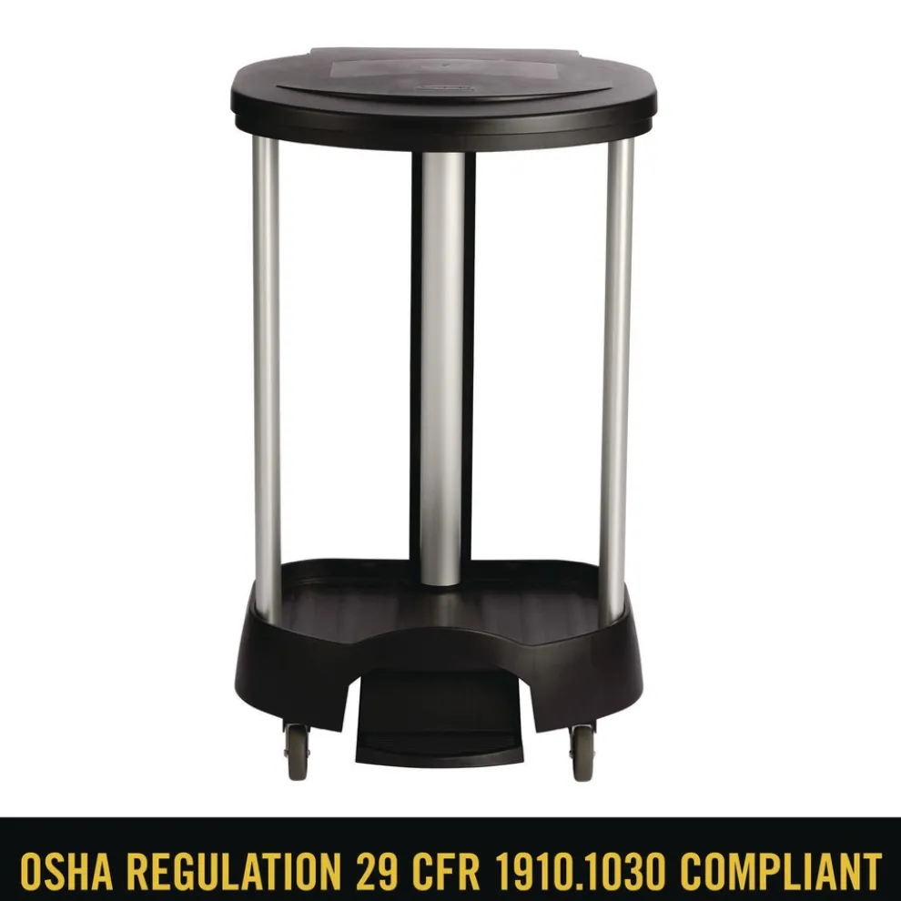 The Rubbermaid Commercial Products Premium Step-On Linen Hamper is ideal for areas where medical waste originates, including patient rooms, lab procedure rooms, and emergency rooms. This linen hamper is a rectangular polypropylene and aluminum hamper with a lid damper and foot pedal that is suitable for use with the 30-gallon Rubbermaid Commercial Premium 6350 linen hamper bag (sold separately) and that complies with Occupational Safety and Health Administration (OSHA) Standard 1910.1030 on blood-borne pathogens for the safe containment of infectious waste. The damper-controlled lid helps contain odors and bacteria and closes gently, making it suitable for hospital rooms and other quiet places. A foot pedal quietly lifts the lid and enables hands-free trash disposal. Polypropylene is more rigid than polyethylene and is resistant to certain chemicals. Aluminum weighs less than steel and resists corrosion and tarnishing. 2 swivel caster wheels on the back and 2 fixed and lockable caster wheels on the front provide quiet maneuverability for noise-sensitive environments. Metal retainer straps hold the linen hamper bag (sold separately) securely in place.