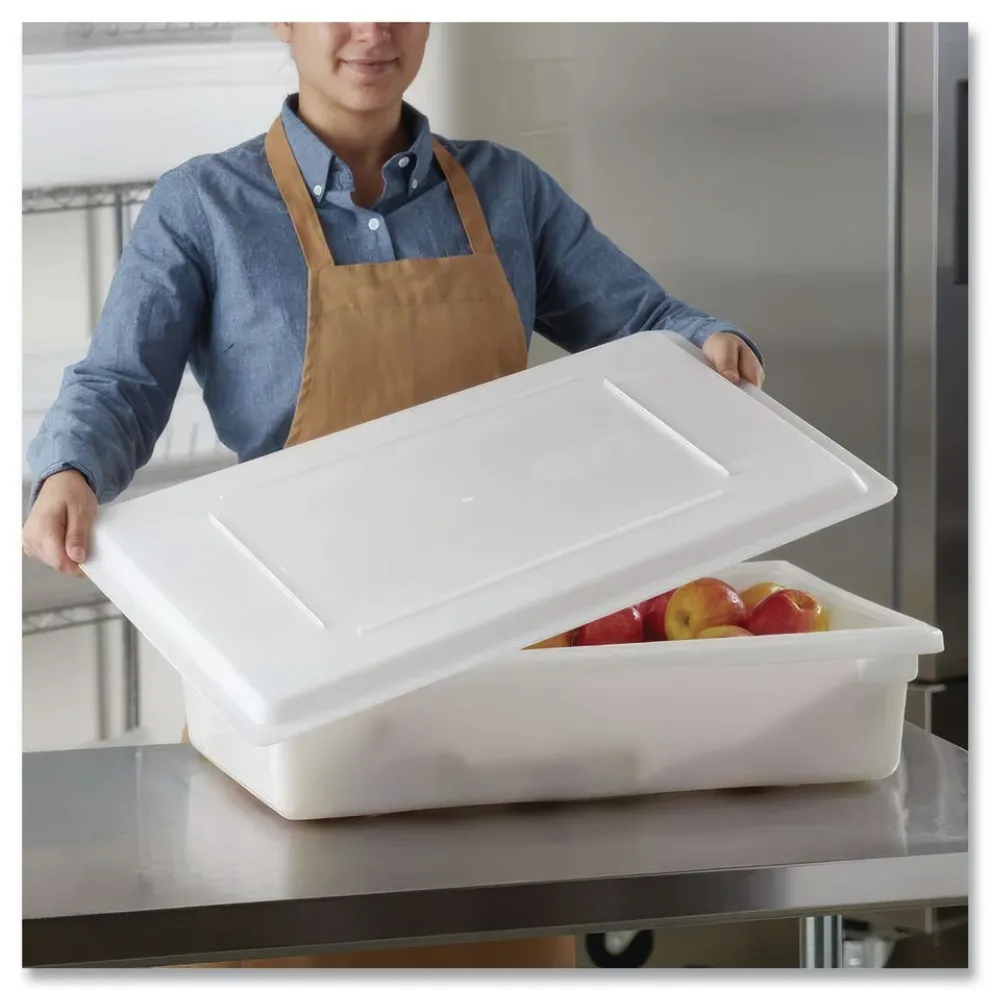The Rubbermaid Commercial Food Storage Lid for Food Tote Box helps reduce food spoilage costs. The food storage container lid is a tight-fitting, snap-on lid with stacking ribs. This bulk food storage container lid reduces risk of cross-contamination, secures storage while stacked, and can be used as tray when displayed upside down.