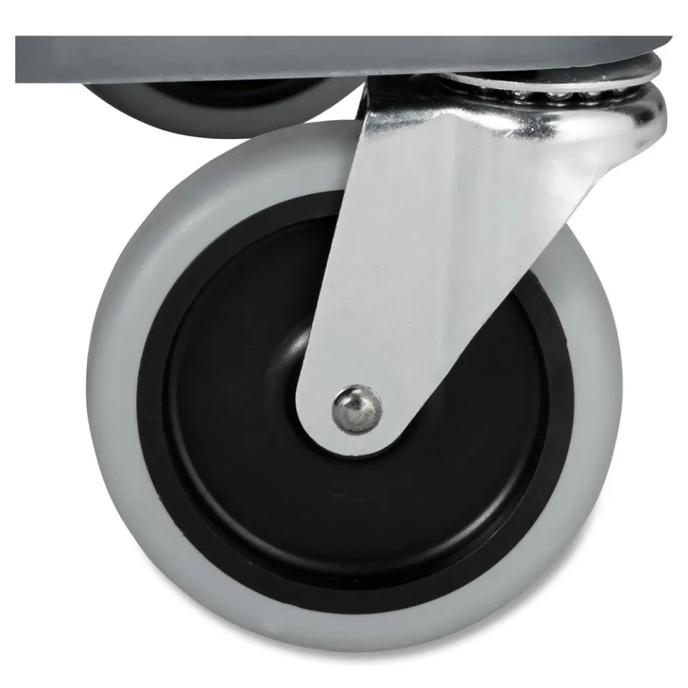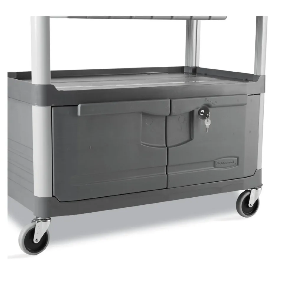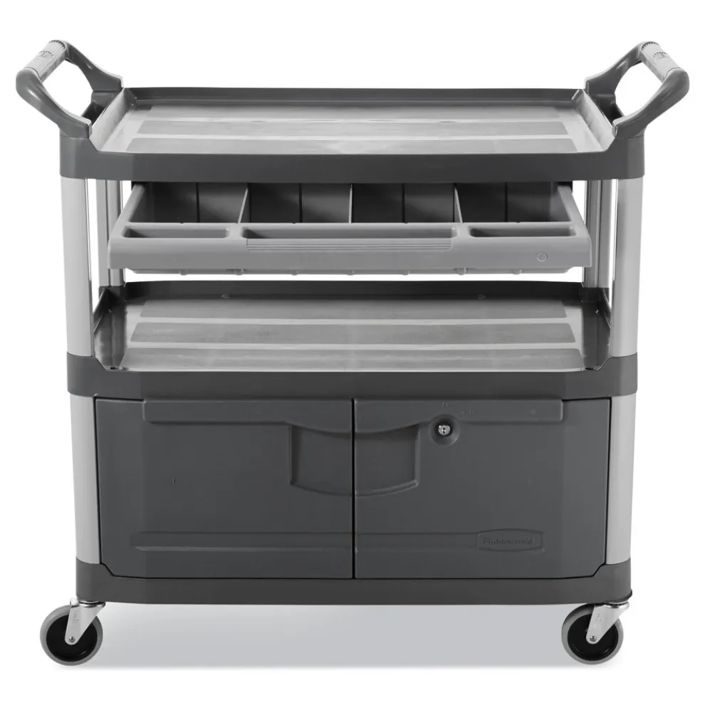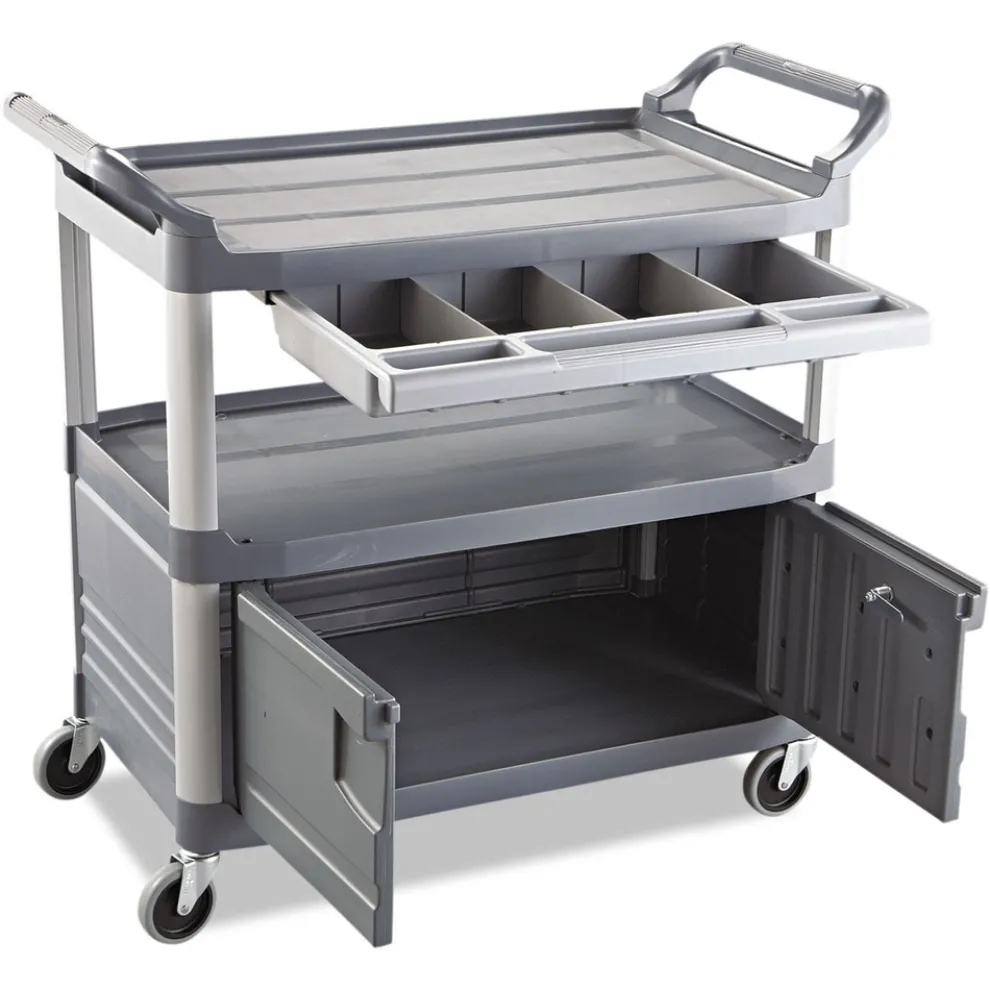 The Rubbermaid Commercial Xtra Instrument and Utility Cart is a rolling utility cart with two shelves, a lockable cabinet and a sliding drawer. Constructed from durable plastic, the wheel cart has sturdy swivel casters for smooth movement, and raised arms on either side for added maneuverability. The sliding drawer provides added space for instruments with easy access.