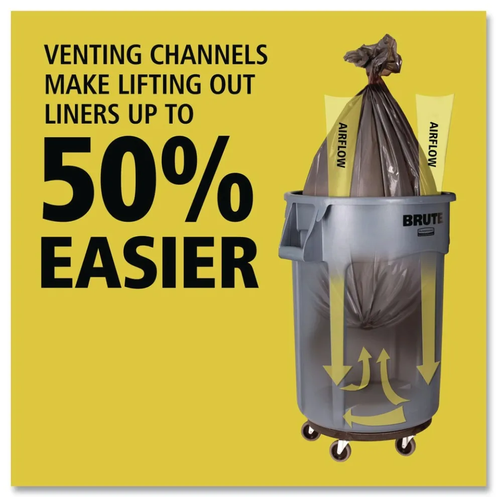 Sets the standard for reliable garbage collection in high traffic areas. Built tough and versatile, these garbage cans feature revolutionary venting channels that let air flow into the receptacle making liners up to 50% easier to remove. Integrated cinches allow bags to be attached to handles without knots for faster liner changes while contoured base handles and rounded top handles make it easier for staff to lift and transport these receptacles in any facility. Constructed of the high-quality materials, these crush-resistant garbage cans have heavy-duty, reinforced bases that hold up even when dragged across rough surfaces. These trash cans are stackable to save space and provide an unbeatable value with their easy-to-clean, seamless construction, UV inhibitor, and do not fade, warp, crack, or crush.