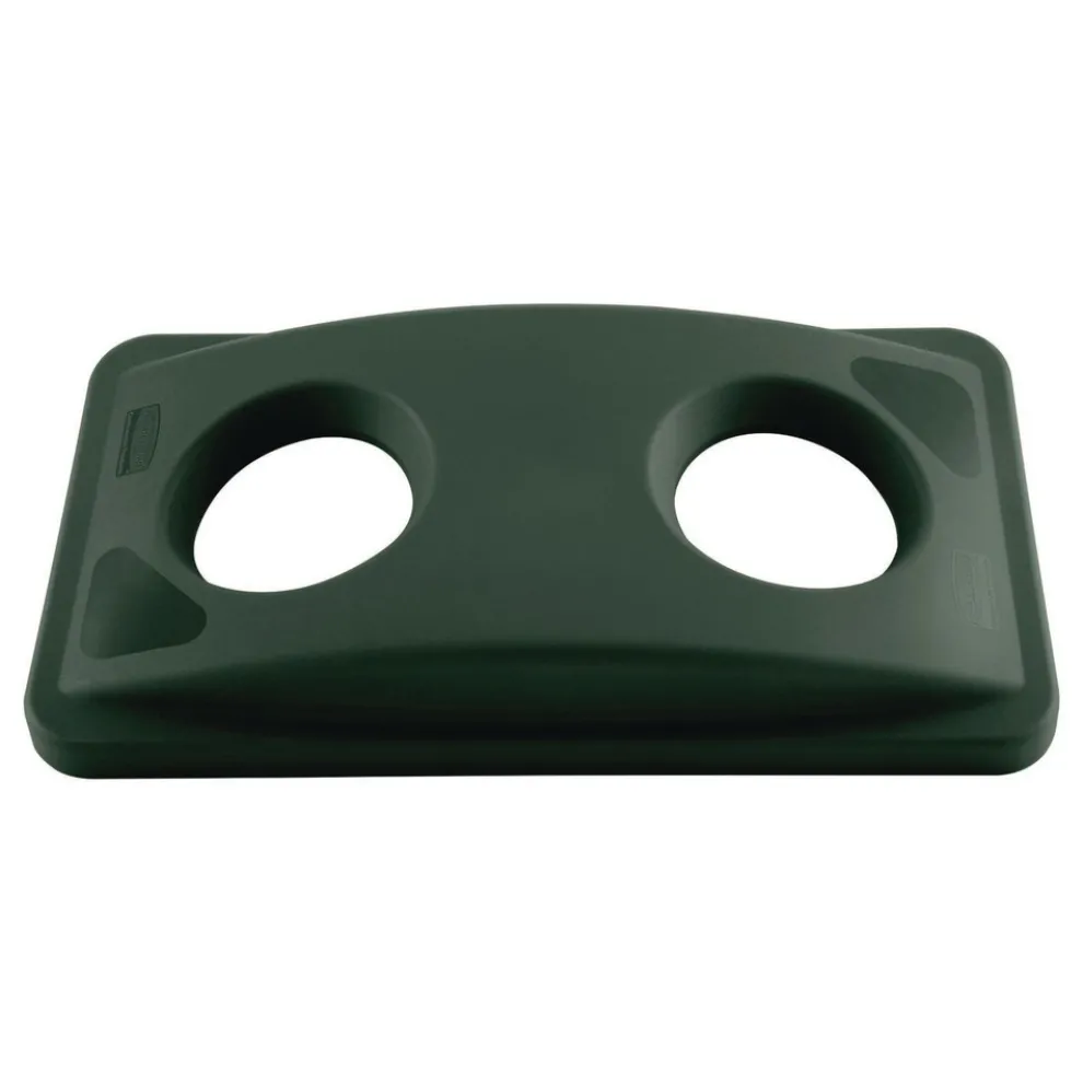 The Rubbermaid Commercial Untouchable Bottle and Can Recycle Bin Top is made from high density polyethylene, which resists moisture and chemicals. The rectangular top has 2 round openings for easily depositing recyclable bottles and cans.