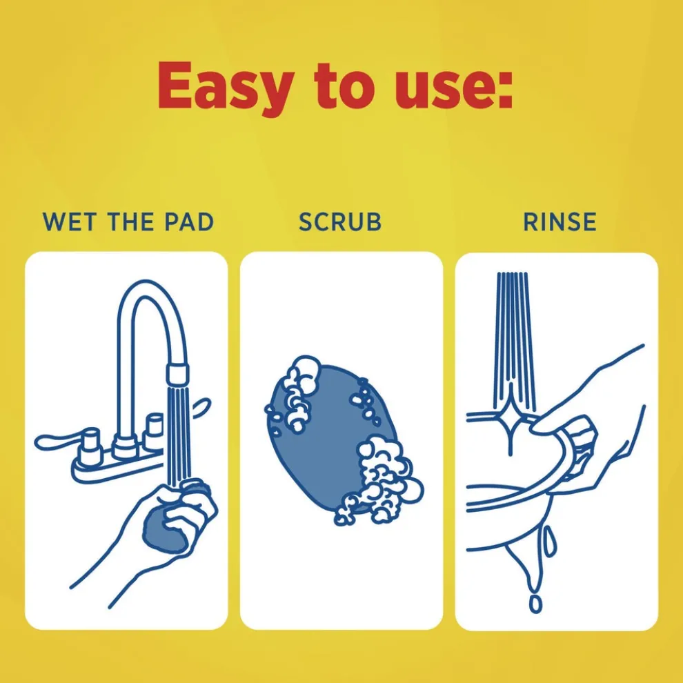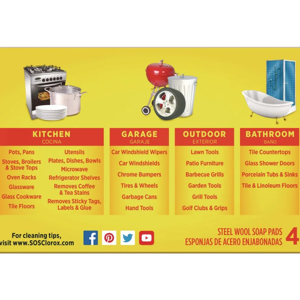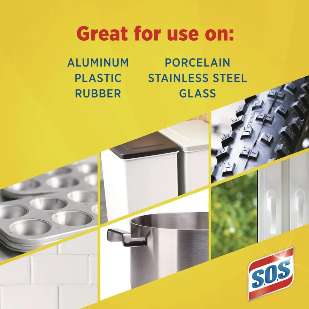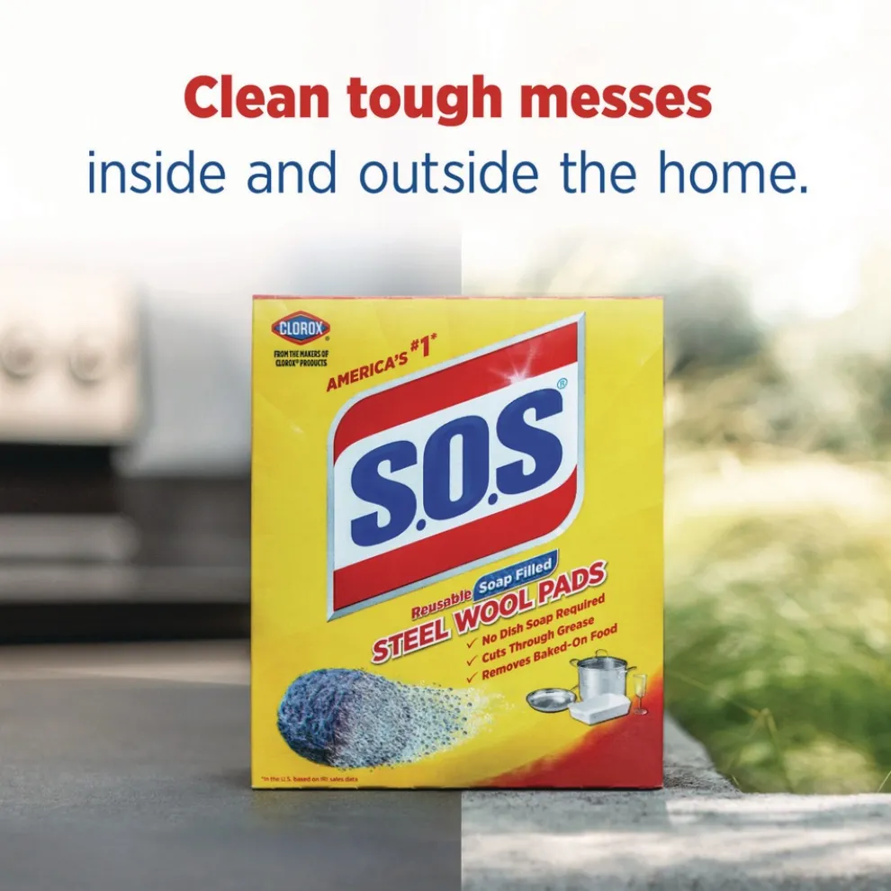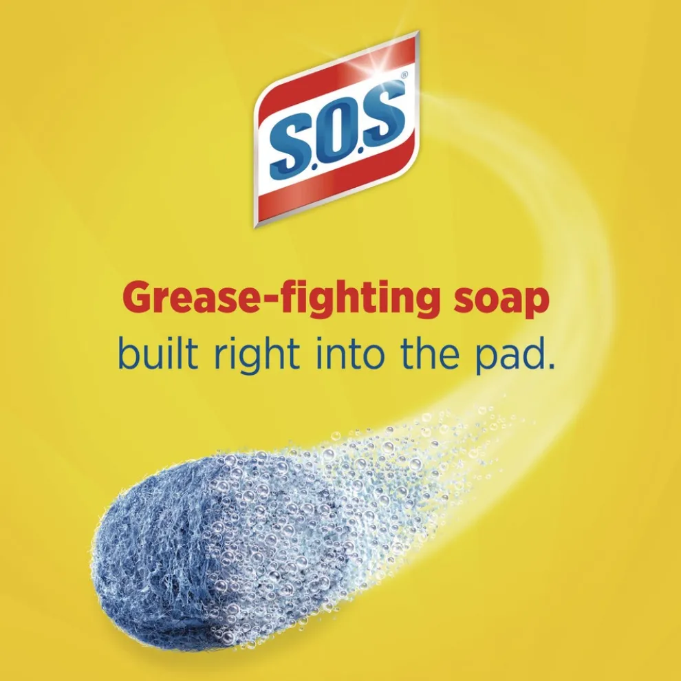 S.O.S Steel Wool Soap Pads are tough so you don’t have to be. Made with durable steel wool and saturated with long-lasting soap, these pads cut through even the toughest baked-on, greasy, grimy messes. They are perfect for cleaning ovens, broilers, cookie sheets and pots and pans. The durable and long-lasting design is made for the toughest jobs and can remove baked-on food from pots or pans. These reusable steel wool soap pads are great outside the kitchen, too. From scrubbing stoves and shower doors to cleaning grills and golf clubs, these pads quickly remove stubborn grease, rust and stains inside and outside the home or workplace. The soap contains rust inhibitors, preservatives, a pH buffer, fragrance and color. Makes aluminum, iron and stainless steel pots and pans sparkle. Cleaning is quick and easy with S.O.S Steel Wool Soap Pads.