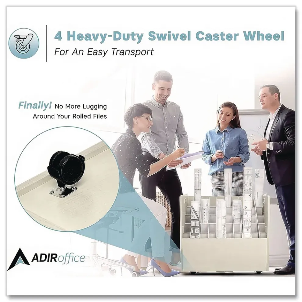 Simple and effective, the Safco Mobile Roll File helps you organize your rolled up documents, plans, posters, paper, proofs, blueprints and maps into tidy rows for easier visibility and access around your home, office or classroom. Slot your rolled up documents or tube-style blueprint holders into the 2.75 in.-square compartments of the Safco Mobile Roll File to keep them organized and readily available. The Mobile Roll File’s tiered, grandstand-style arrangement of its compartments accommodates rolls of different lengths and helps keep them separated enough so that you can both see and access each with greater ease. Easily maneuver the Mobile Roll File around your immediate workspace on its four 2 in. pivoting wheels to help keep your rolled up reference documents and materials closer to where you’re actually working, so they’re always within reach. Featuring a robust furniture grade particleboard shell with a durable textured vinyl laminate finish, the Mobile Roll File’s sturdy cardboard dividers with plastic supports help keep your important rolled files neat and orderly. And it’s not just for engineering and architecture, either. Safco’s Mobile Roll File can also help tackle the tall task of wrangling your holiday wrapping paper collection at home or putting the packing supplies in proper order in your office mailroom, even use them in the classroom to keep maps and reference charts organized and easily accessible.