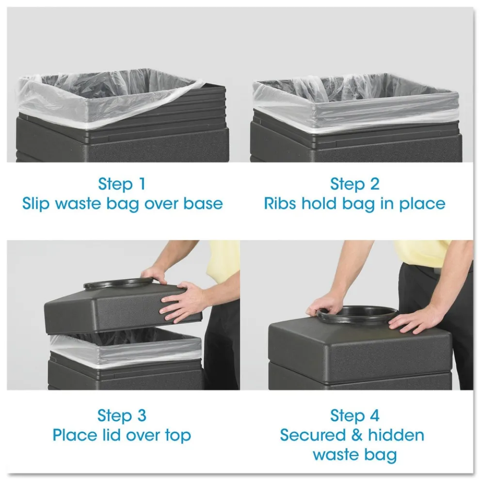 Recessed panel design for any first impression areas. High-density polyethylene plastic will not chip or dent. UV inhibitors limit fading in sunlight. Adaptable for anchoring and weighting devices. Uses standard 32 in. x 44 in. trash bags. Telescoping base hides bag. Panels feature fluted design with a recessed bottom.