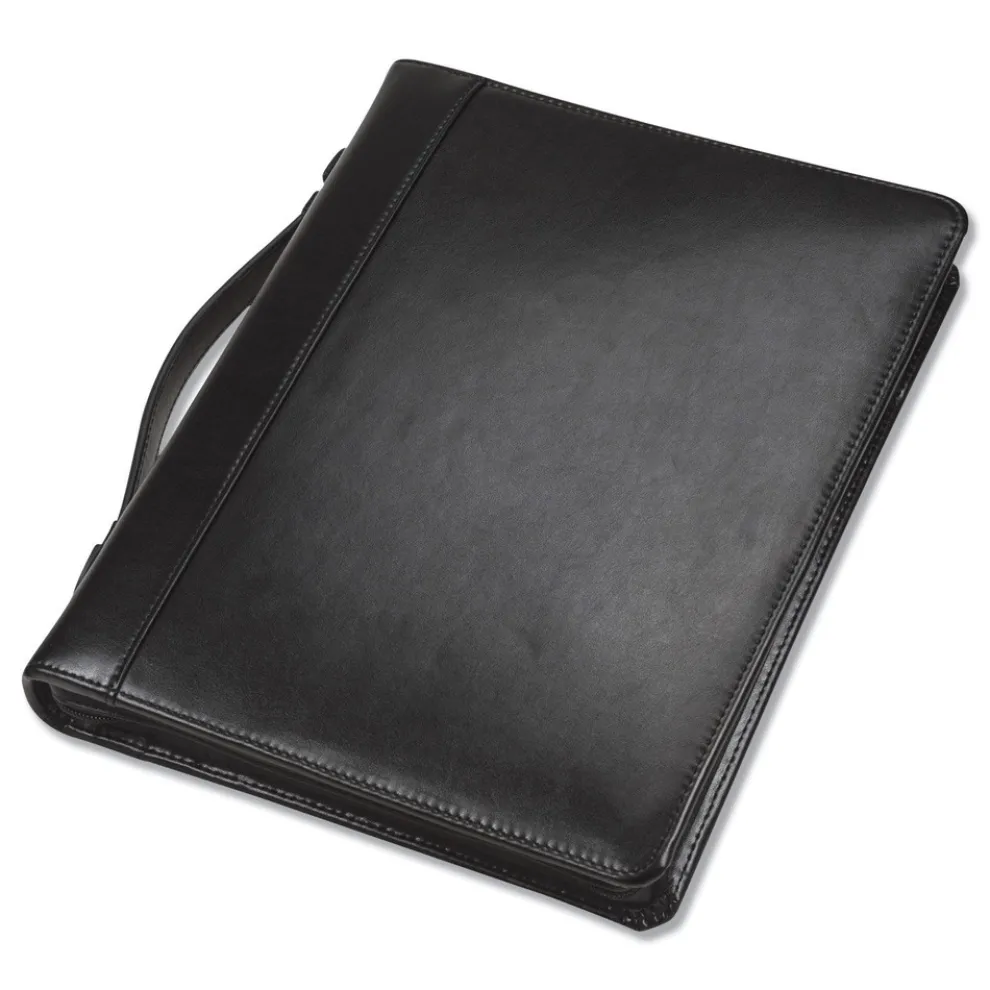 This Leather Zipper Padfolio is a unique organization tool designed for those that want to get noticed. This executive padfolio combines style and functionality to work as a versatile business partner. Designed to perfection, this zipper padfolio is crafted using superb quality durable black leather with hand-stitched edge detailing for a classic look. The gender-neutral black leather exterior looks great and feels nice too, but more importantly, it will stand the test of time. The inside of this business padfolio is packed with pockets where you can store and organize all your extra digital accessories, documents, business cards, and other business accessories. The interior lined pocket with hook and loop closure lets you store your iPad or most tablets up to 10.1 in. The expandable document pocket provides convenient space to store loose papers. The zippered pocket keeps confidential documents or small media items like flash drives, CDs/DVDs, coins, keys, etc. safely, and business card pockets ensure easy and quick access. This business case is equipped with a 1 in. round ring bonder that can comfortably hold up to 225 paper sheets. The wrap-around zipper closure ensures safety of all your digital and paper contents in office or when you are on the go. Comes with convenient and comfortable spine mounted handle that can be retracted to reduce the case size when required. Whether carrying to a meeting or on your commute, this portfolio will fit nicely in your hand and make transportation a breeze.