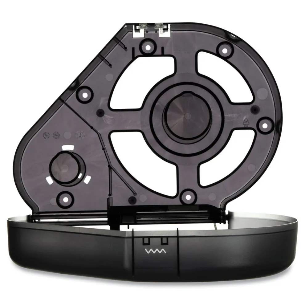 Toilet tissue dispenser eliminates stub roll waste and ensures the continual availability of paper through the Infinity System, which protects the primary roll until the stub roll is used up. Conveniently universal, dispensing any quality or brand of toilet tissue. Attractive, flowing wave design built into the plastic makes it aesthetically pleasing. Dispenser is tough, with break-resistant plastic construction. A replaceable finger lock helps keep it secure.