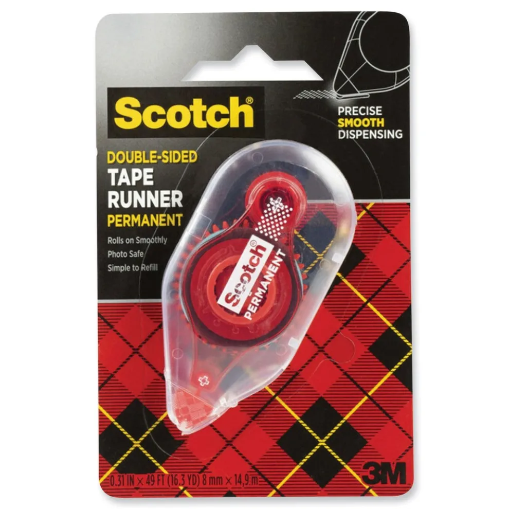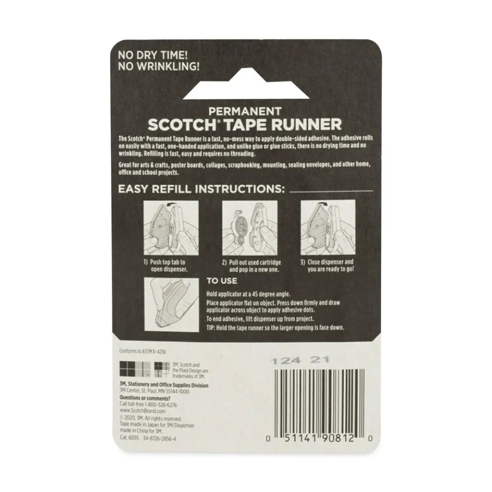 Scotch Tape Runner is the fast, no mess way to apply double sided adhesive, and it’s refillable. The adhesive rolls on easily, and unlike glue or glue sticks, there is no drying time and no wrinkling. Roller applies a fine dot pattern of double sided adhesive for a clean cut and secure hold. Great for home, office, and school projects.