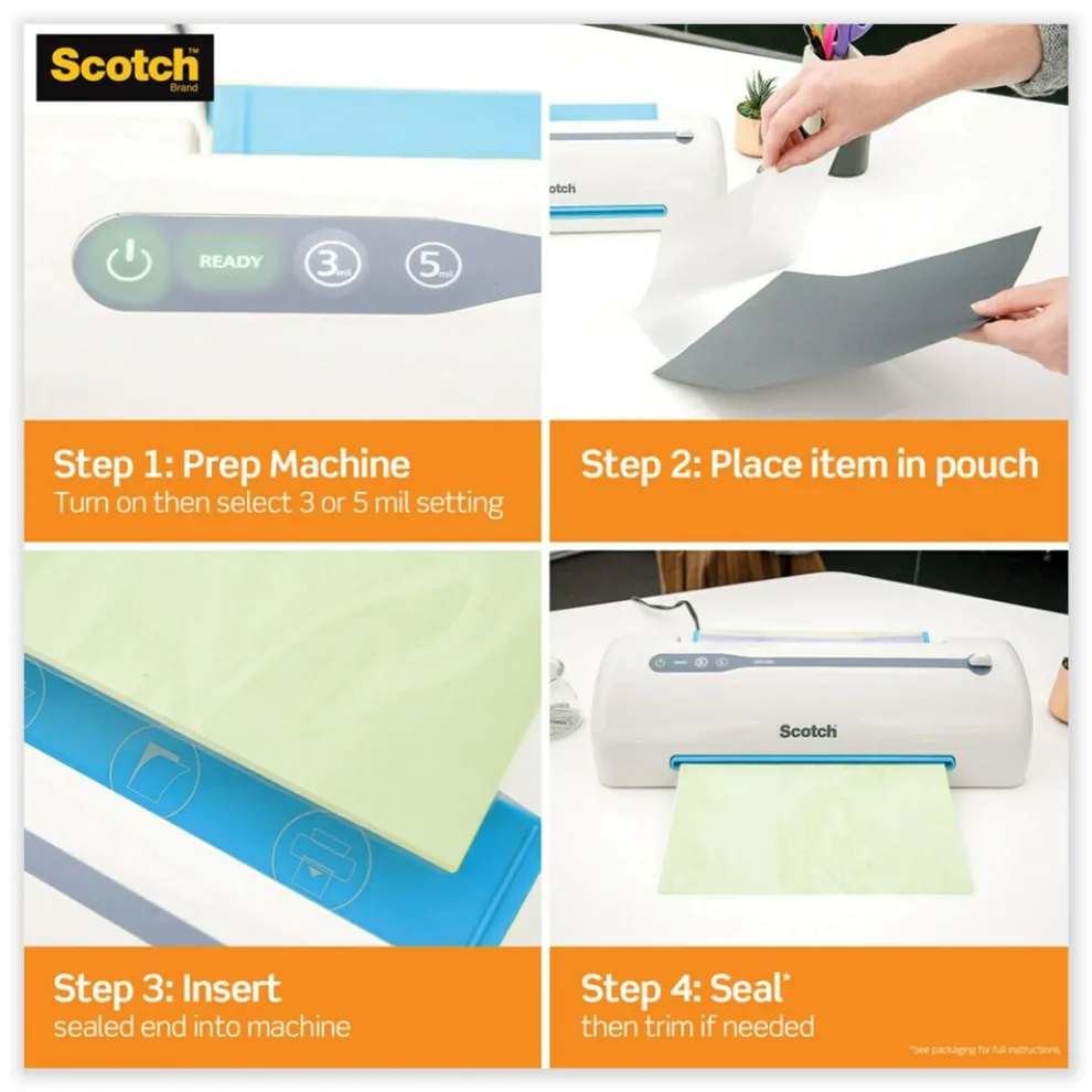 Scotch Laminating Pouches protect documents you handle frequently. They are for use with thermal laminators and create a permanent seal for long-term protection. Pouches are clear to let important information show through. Try other quality products from Scotch Brand for all your needs in the home and office.