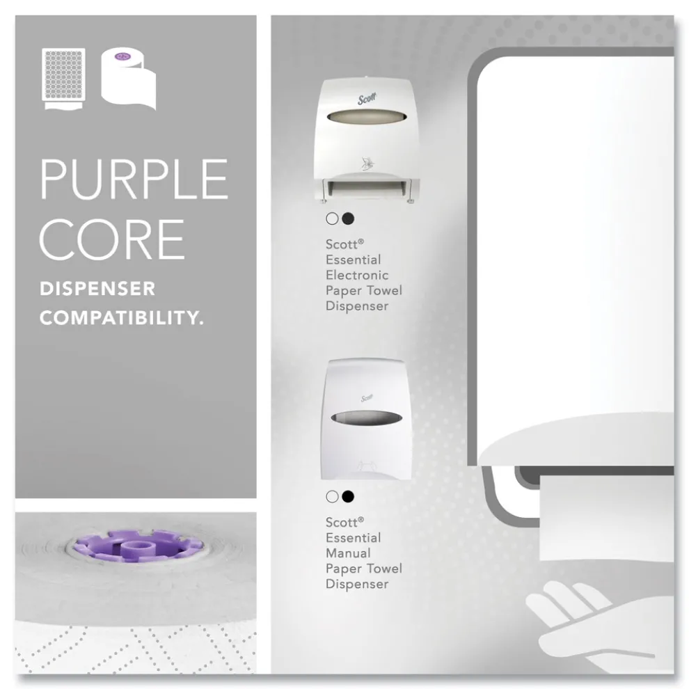 More than ever, hygiene plays a significant role in employee, guest, and tenant comfort and satisfaction. When designing our towel systems, we looked at what matters most to restroom users, hygiene, efficiency and sustainability. Scott Essential provides reliable balance of efficiency, performance and value. If you’re looking for high-capacity commercial paper towels compatible with most universal roll towel dispensers, the white Scott Essential High Capacity Hard Roll Paper Towels are an excellent choice for your business. The roll is compatible with a variety of Kimberly-Clark Professional dispensers and many universal towel dispensers. Plus, they are high-capacity, designed to reduce maintenance time, run-outs and complaints. These absorbent commercial paper towels are designed for efficient general-purpose cleaning and drying, so your employees and guests will use less, saving you money.