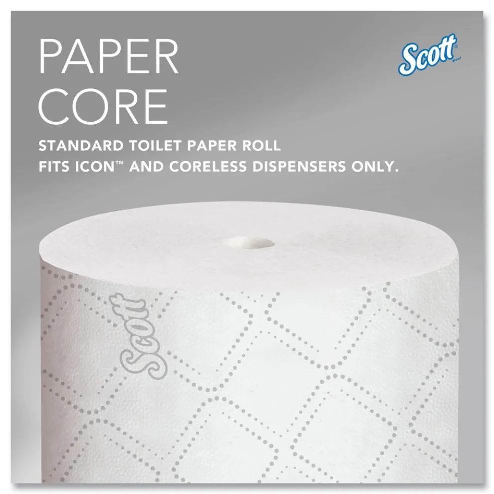 Scott Pro provides state of the art solutions to maximize productivity with Scott Pro Paper Core High Capacity Bath Tissue. Now with a nearly-invisible paper core for better roll utilization, this 2-ply bathroom tissue offers 10 percent more sheets/case than the industry standard for high-capacity standard roll bathroom tissue and twice the length of a standard roll bathroom tissue. Waste less without disposing of a corrugate core, with a paper core dispersible in water.