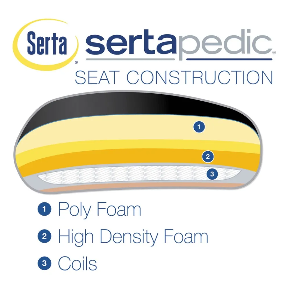 Active Contoured Ergonomic Support (ACES) provides support while perching to support your back at any sitting position. SertaPedic comfort support cushion system with memory foam and pocket coils. Upholstered in a durable Culp fabric. Height adjustable arms for custom comfort. Pneumatic lift with tilt tension adjustment and lockout feature. Five-star nylon base with casters for easy mobility. American Chiropractic Association endorsed office seating.